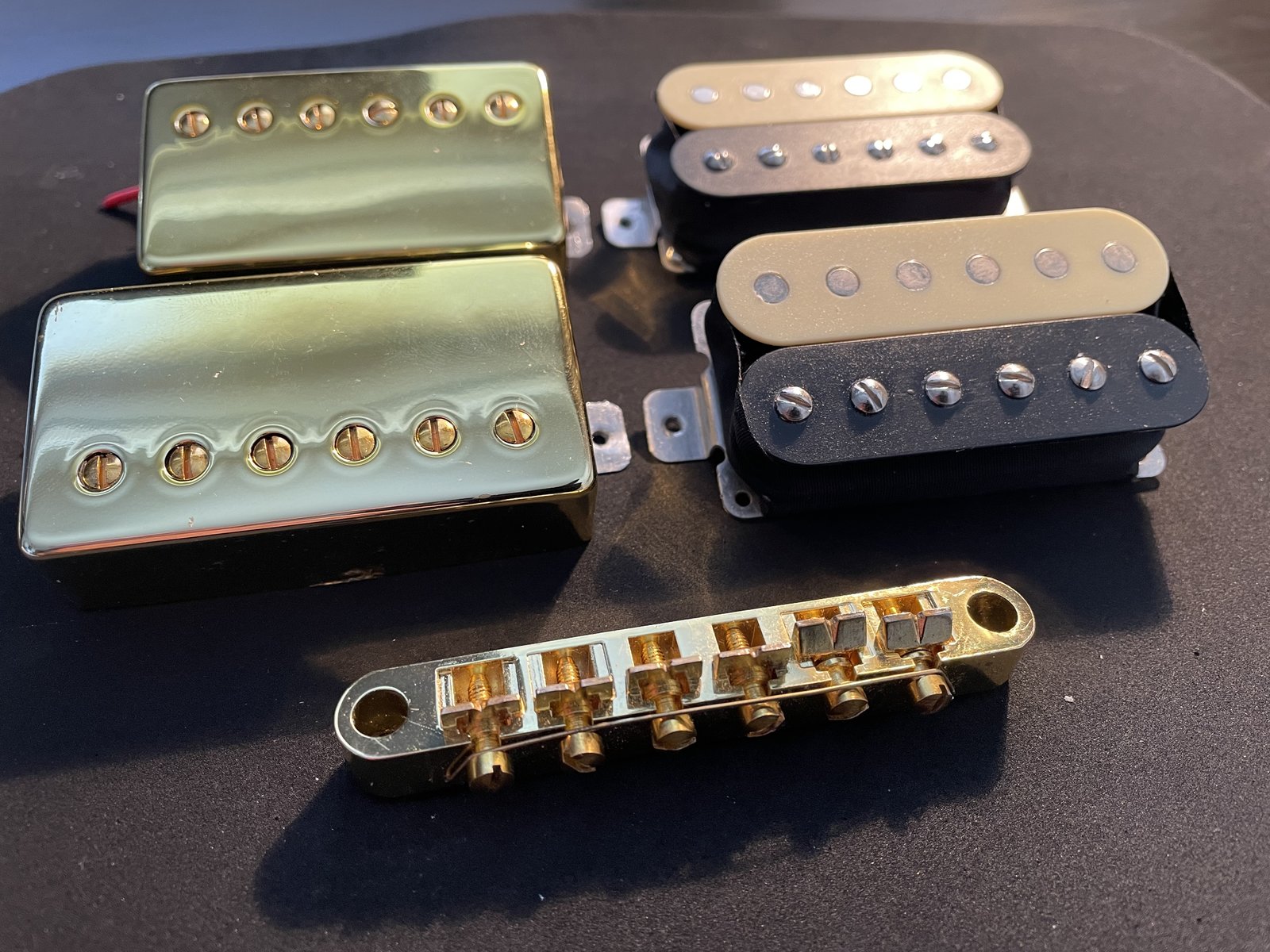 | Kiinanskitoista parit roinat myyntiin: Kullatuilla kuorilla alnico 5 humbuckerit. Oikein hyvä paf-tyyppinen soundi, ei vahatut. Hinta 25 ¤ / pari. Piuhat katkaistu, mutta tilaa uusien liittämiseen on. Avokelaiset alnico 5 humbuckerit. Hinta 20 ¤ / pari. Soundiltaan samantyyppiset ja vahaamattomat kuten edellisetkin. Piuhat pitkät. Kullattu tune-o-matic talla. Tapit ja holkit mukaan. Hinta 10 ¤. Helsingin Vuosaaressa, voin toki postittaakin ostajan piikkiin. Hinnat valmiiksi tingityt. Hinta: 55 € | |