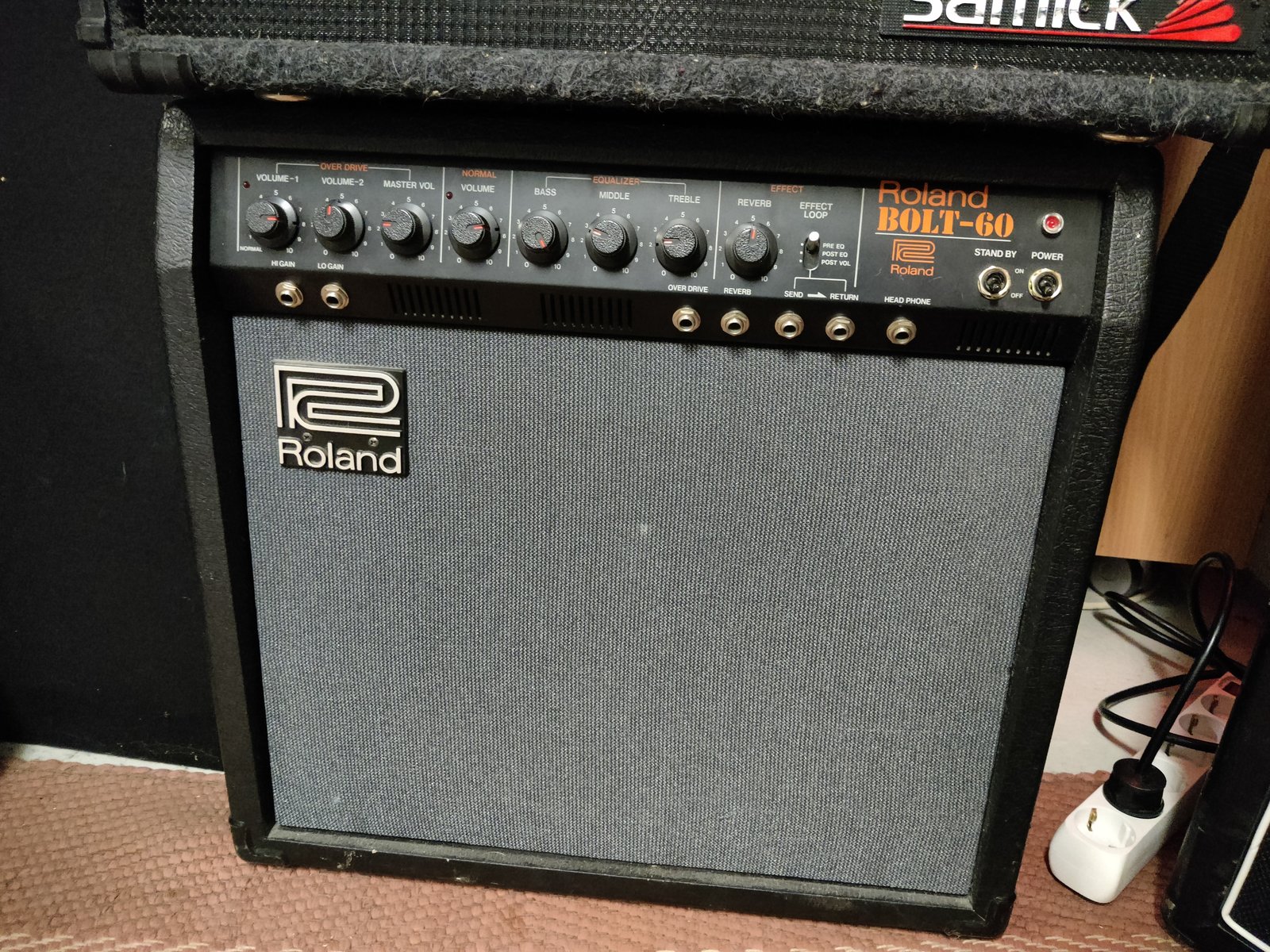 | Pitkään käyttämättä ollut Roland Bolt 60. Potikat hiukan jo rahisee, muuten soiva peli. Kantokahva on jäänyt johonkin matkan varrelle ja etukangas ei ole alkuperäinen. Joku Samickin trankkukombo. Ääni tulee. Roland 300¤ Samick 50¤ Nouto Loimaalta, en lähetä. En muista juurikaan kyttäillä pikaviestejä, sähköposti ja WA tavoittaa nopeiten. Vaihdossa kelpaa kompura- ja/tai reverb-polkimet. Hinta: 300 € | |