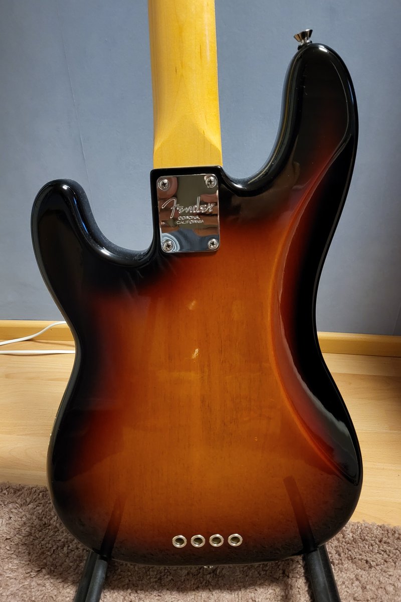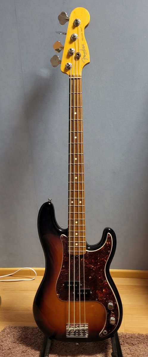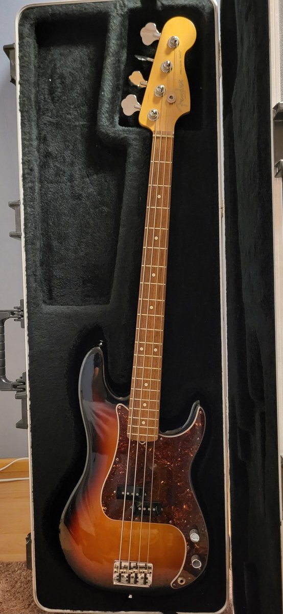 The real thing. Precision Am Standard, kuulostaa juuri niin hyvältä kuin aidon presarin kuulukin, oli sitten flatit tai roundit kielet. Nyt roundit, mutta molemmat tulee mukaan. Soitettavuus erinomainen, hyvissä säädöissä. 15 vuotta on tuonut soundiin vaan parannusta, mutta ei mitään ylimääräisiä jälkiä mihinkään. Tästä ei presari enää parane. Sunburst, Rosewood ja Tortoise yhdistelmä on luonnollisessa valossa sävyiltään juuri kuten kuuluu. Kaula modern C, joten miellyttävä soittaa. Alkuperäinen kova laukku kuuluu mukaan, sekä mukana alkuperäiset laput ja säätötyökalut. Hinta: 1300 € | |