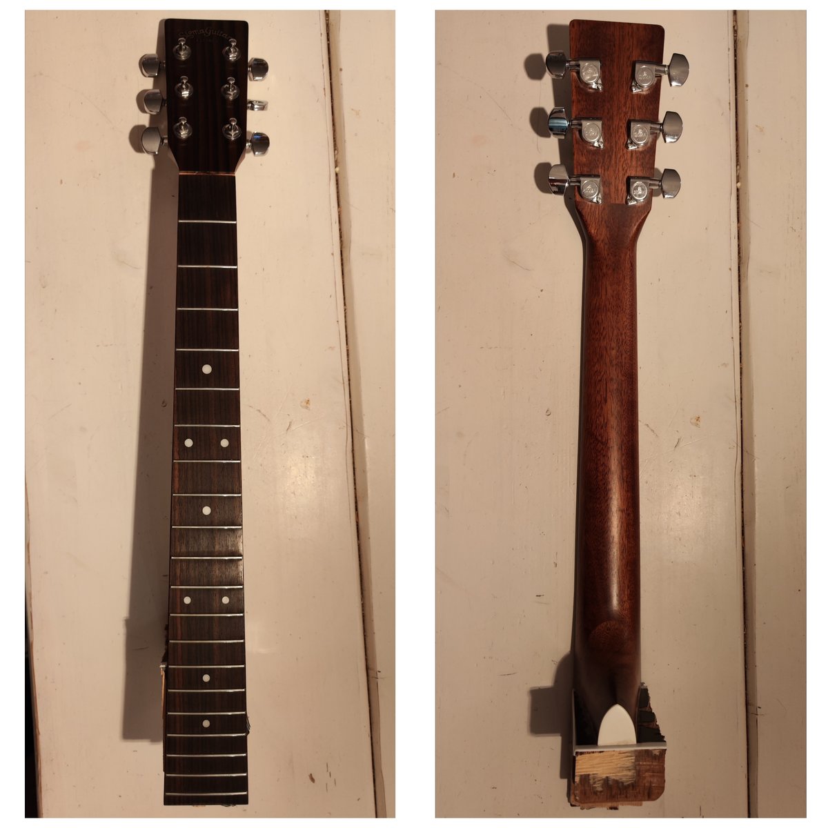 | A1 kaula-aihio vaikka sikarilaatikkoon. Taitava asentaa mihin vaan. + Suora kaula, ei ole ehtinyt muodostua edes bodyn liitoskohtaan hyppyriä. + Nauhat erittäin hyvät, ei kuoppia. Muutama pyyhkäisy santapaperia ja uudesta menee. + 2-toiminen rauta toimii hyvin ja mutteri bueno. + Otelauta kokonaisuudessaan ehjä ja hyvä. - 5/6 orkkisvirien nylonprikkaa ryöstetty (ks.kuva 2 vas.ylh.) - Satula uupuu. Tuon hintaan Treen seutu, lähetys sovitaan Hinta: 50 € | |