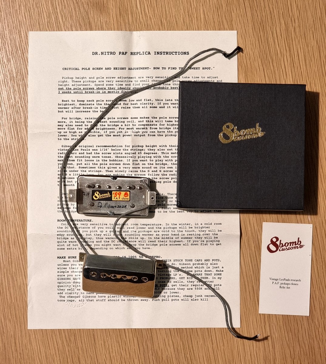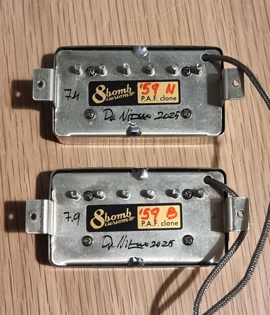 | Erittäin asiallinen PAF-setti. Selkeä ja erotteleva soundi, mutta rähisee kuitenkin tarvittaessa mukavasti. Lippuset ja lappuset ja ruuvit tallessa. En ole koskaan näistä kuoria irroittanut, mutta kelojen väritys on "Slash zebra", mikäli sillä mitään merkitystä on. Alnico 4 -magneetit, kaula 7,4 kOhm ja talla 7,9 kOhm. PS. Sama seppä tekee myös melkoisella pieteetillä kitaroiden relikointeja, löytyy Youtubesta nimellä Dr. Nitro tai 8Bomb Custom. Hinta: 280 € | |