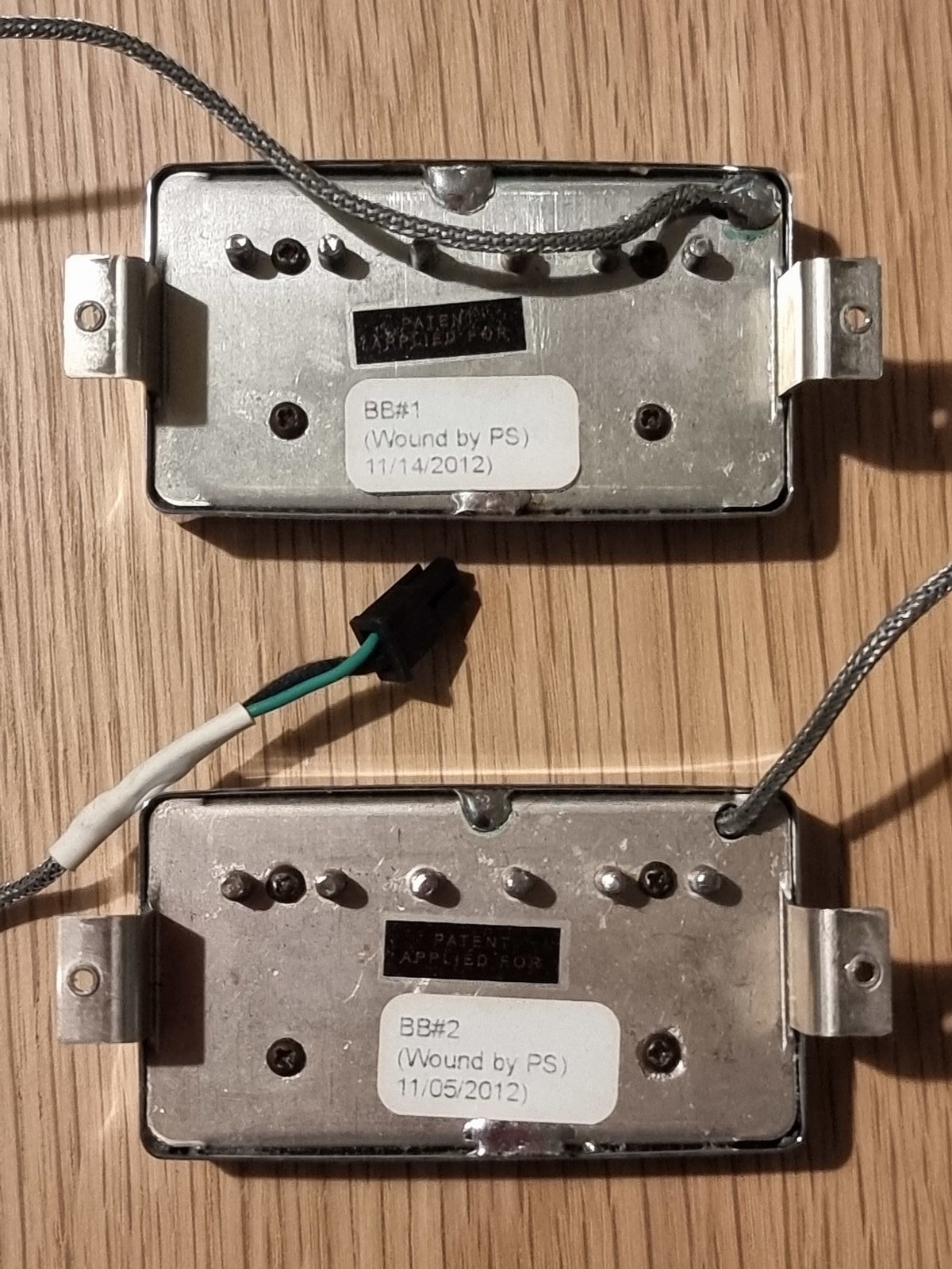 | Vuodelta 2012, mutta suht siistissä kunnossa. Nämä on riipaistu piirilevy-Gibsonista, eli piuhojen päissä on pikaliittimet. Toki jos moiset modernit kotkotukset puistattaa, ne voi halutessaan nyppäistä pois. Alnico 2 -magneetit. Hinta: 180 € | |
