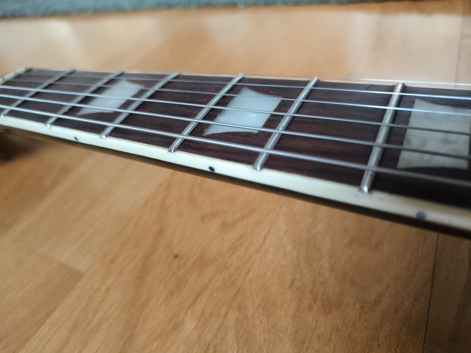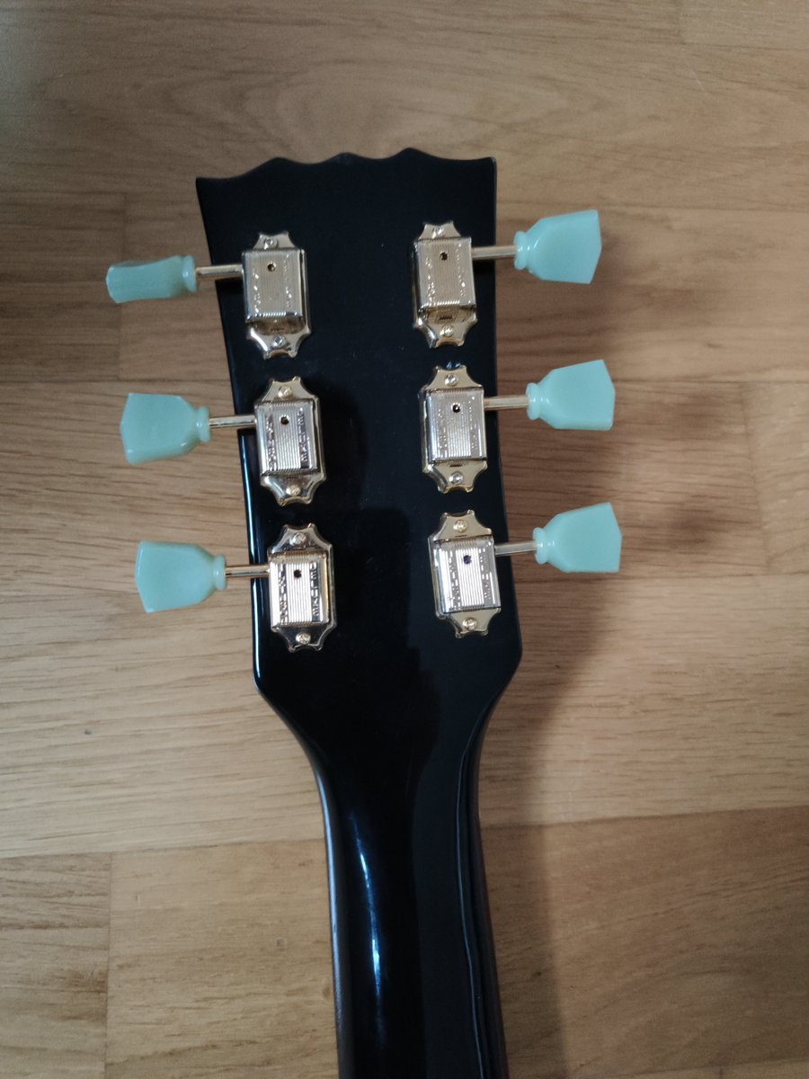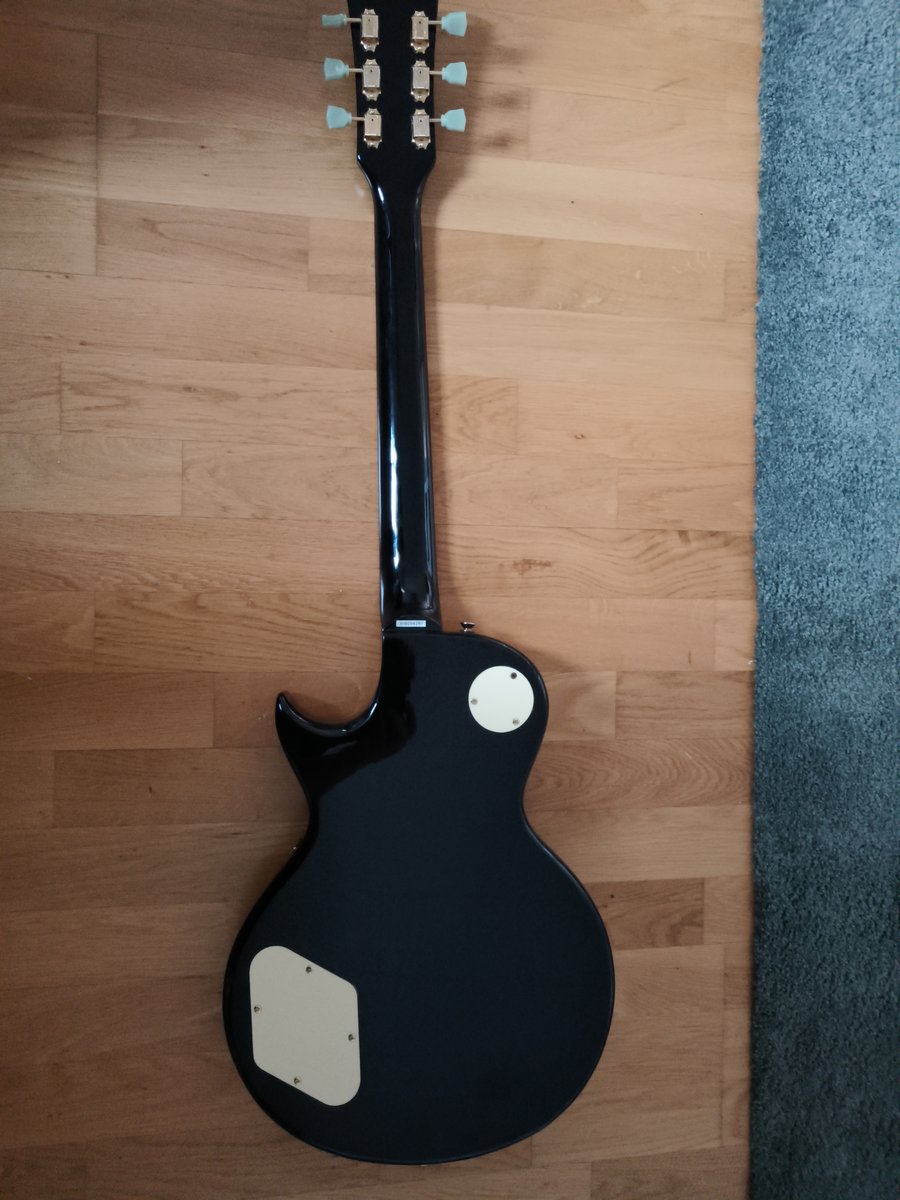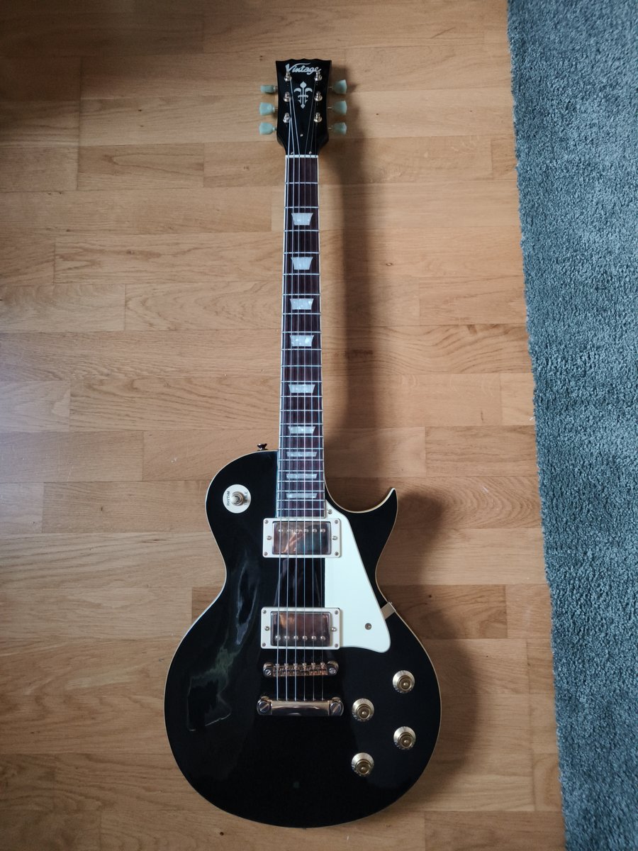 Vuoden 2008 Vintage V100BB (non reissue). Eli perus Les Paul tyylinen kitara Wilkinsonin osilla. Ikäisekseen hyvässä kunnossa. Nauhanpäät on tässä joskus tullu hiottua, mutta muutoin alkuperäisessä kuosissaan. Mikkikehyksissä lähinnä näkyy kitaran ikä. Kaula melko samantuntuinen kuin minun Epiphone Les Paulissa. Paksuus ensimmäiseltä nauhalta 2,25 cm ja ylempää 2,5 cm. Mikit PAF tyyliset. Model Name V100BB (Black with Gold Hardware) Body Mahogany with a Carved Top Neck Mahogany (Set Neck construction) Fretboard Rosewood Scale Length 24.75" / 628mm Frets 22 Neck Inlays Pearloid Crown inlays Pickups Two Wilkinson® Double Coil Humbuckers Controls 2 Volume, 2 Tone, 3-Way Toggle Switch Tuners Wilkinson® Deluxe (WJ44 or similar, Gold finish) Bridge Tune-O-Matic with Stop Bar Tailpiece (Gold finish) Color Gloss Black Ei laukkua joten mieluiten nouto. Tervetuloa koesoittamaan. Hinta: 300 € | |