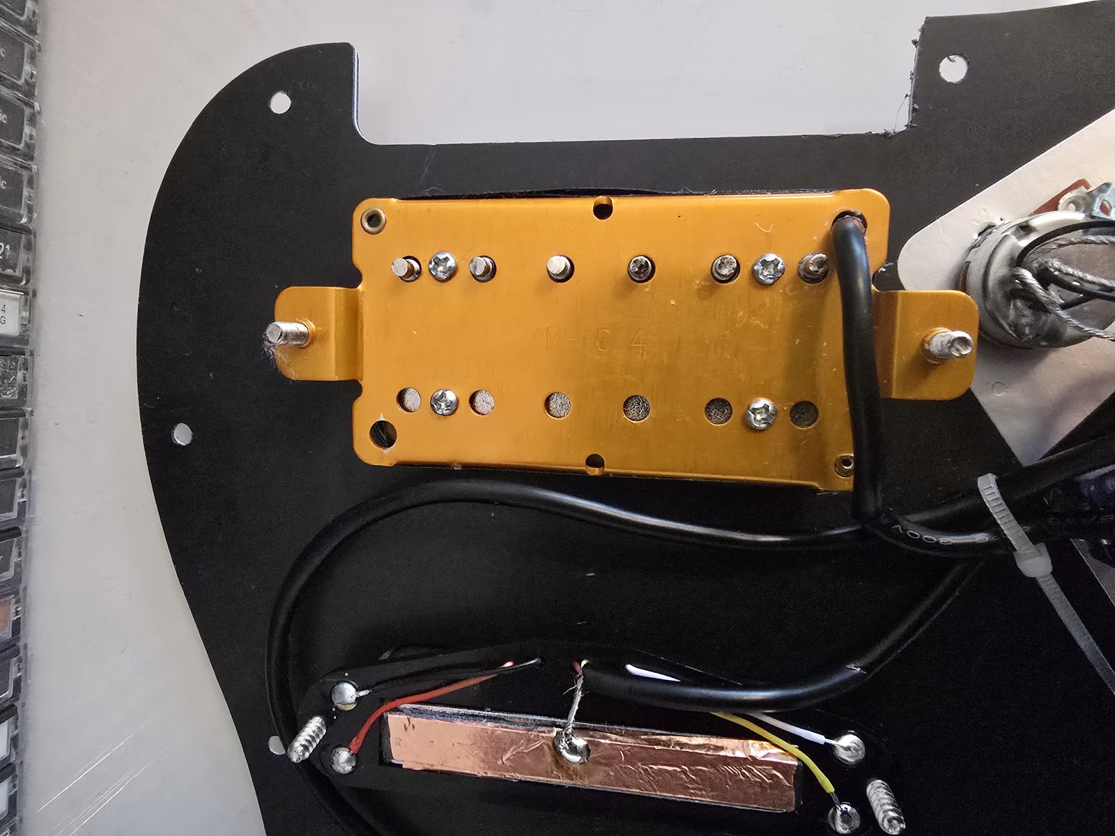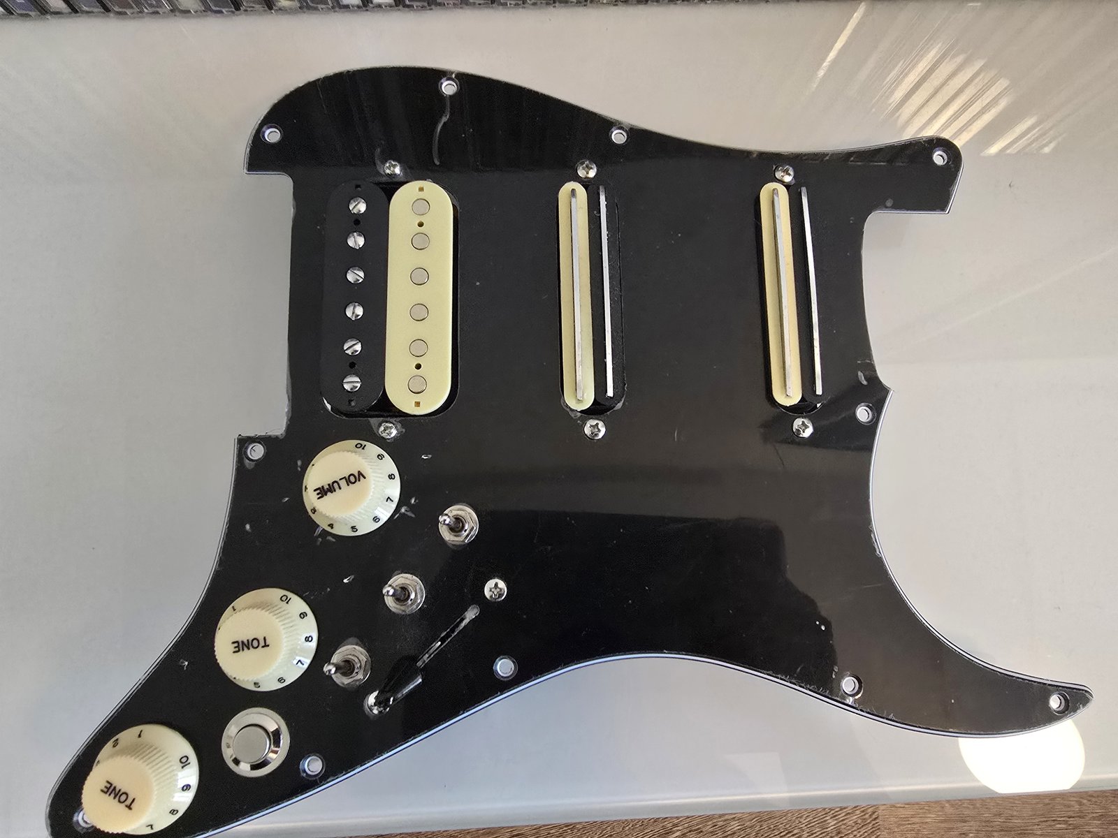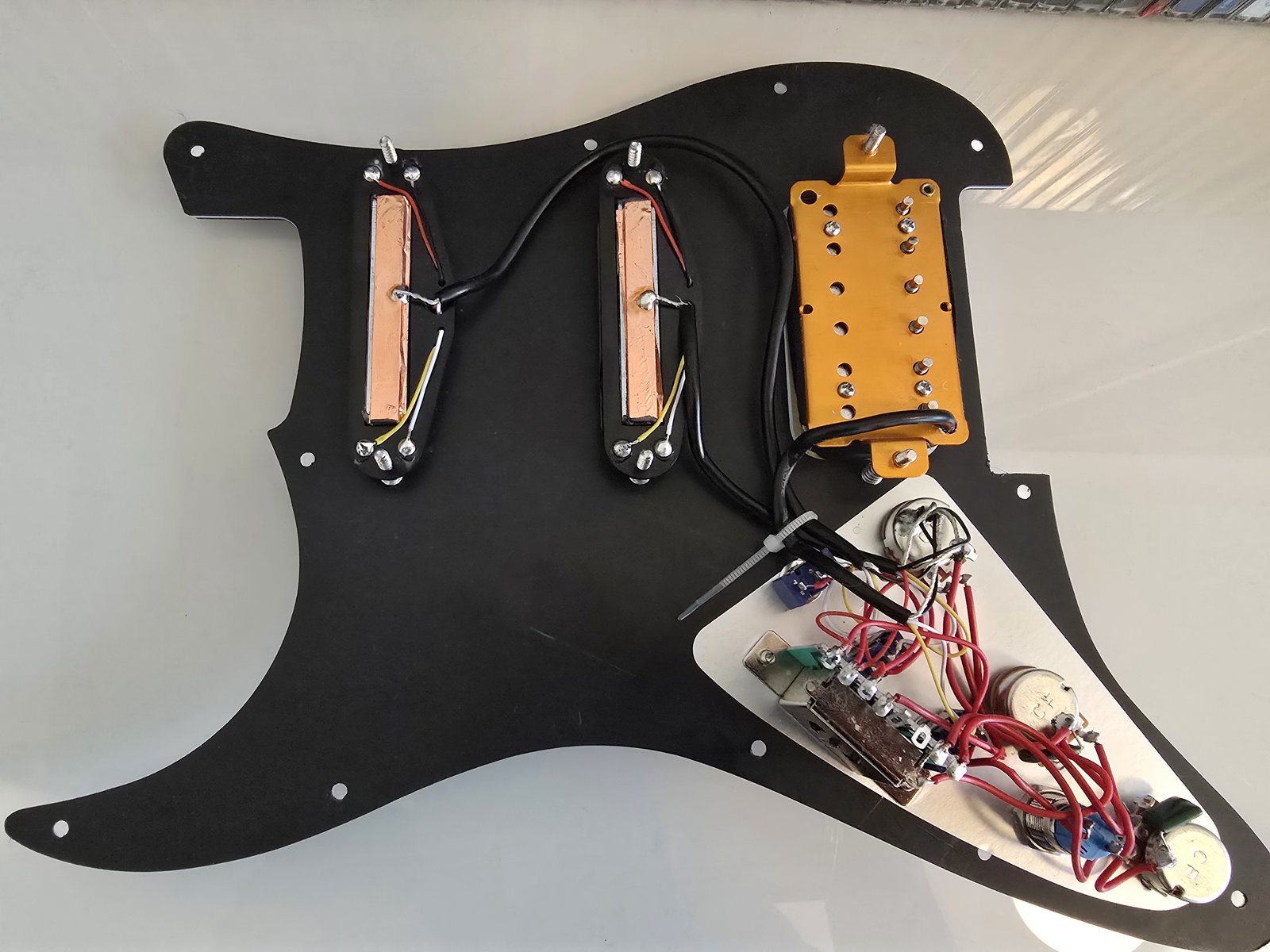 Myyntiin monipuolinen Stratosetti valmiiksi pleksiin ladattuna ja kytkettynä. Humbucker tallassa ja keskellä ja kaulassa railstyyliset humbuckerit. Tavallinen 5-way switch ja jokaiselle mikille oma miniswitch, joka puolittaa kyseisen mikin. Todella monipuoliset soundivaihtoehdit. Hopeanvärinen nappi toimii killswitchinä. Koko setti ilmeisesti tilattu Amazonista, ebaystä tai vastaavasta, tuossa aika samannäköinen setti ebayssä; https://www.ebay.com/itm/205106159644 Postitus onnistuu ostajan piikkiin. Hinta: 30 € | |