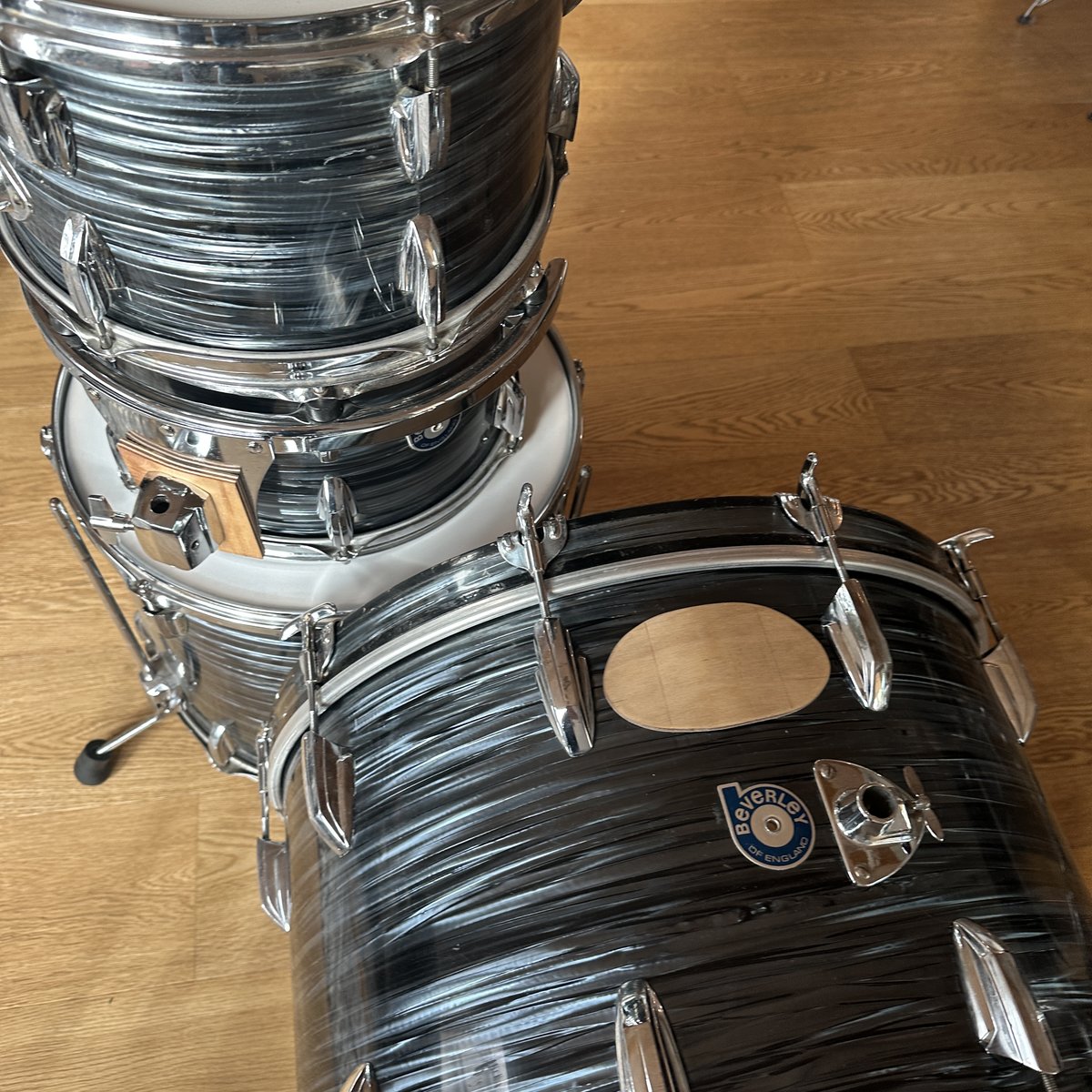 Beverleyn setti jostakin 60-70-lukujen vaihteesta. Rungot skandikoivua, paitsi lattiatom joka mahonkia¤. Beverleyllä oli tapana miksailla puulaatuja jollakin logiikalla. Basarin wräppi haljennut yhdestä kulmasta ja se on paikattu. Wräppi on hieno Grey Silk Pearl, mutta valitettavasti sen saatavuus on nolla. Tomipidikkeet jääneet matkalle, ja 12-tuumaiseen on vaihdettu vähän epäelegantisti Rims Taman pidikkeellä. Rimsiä lukuunottamatta muita telineitä ei tule mukaan, ei myöskään kuvissa näkyvä virveli. Settejä on liikaa joten tämä nyt sopivasti 450 eurolla. Hinta: 450 € | |