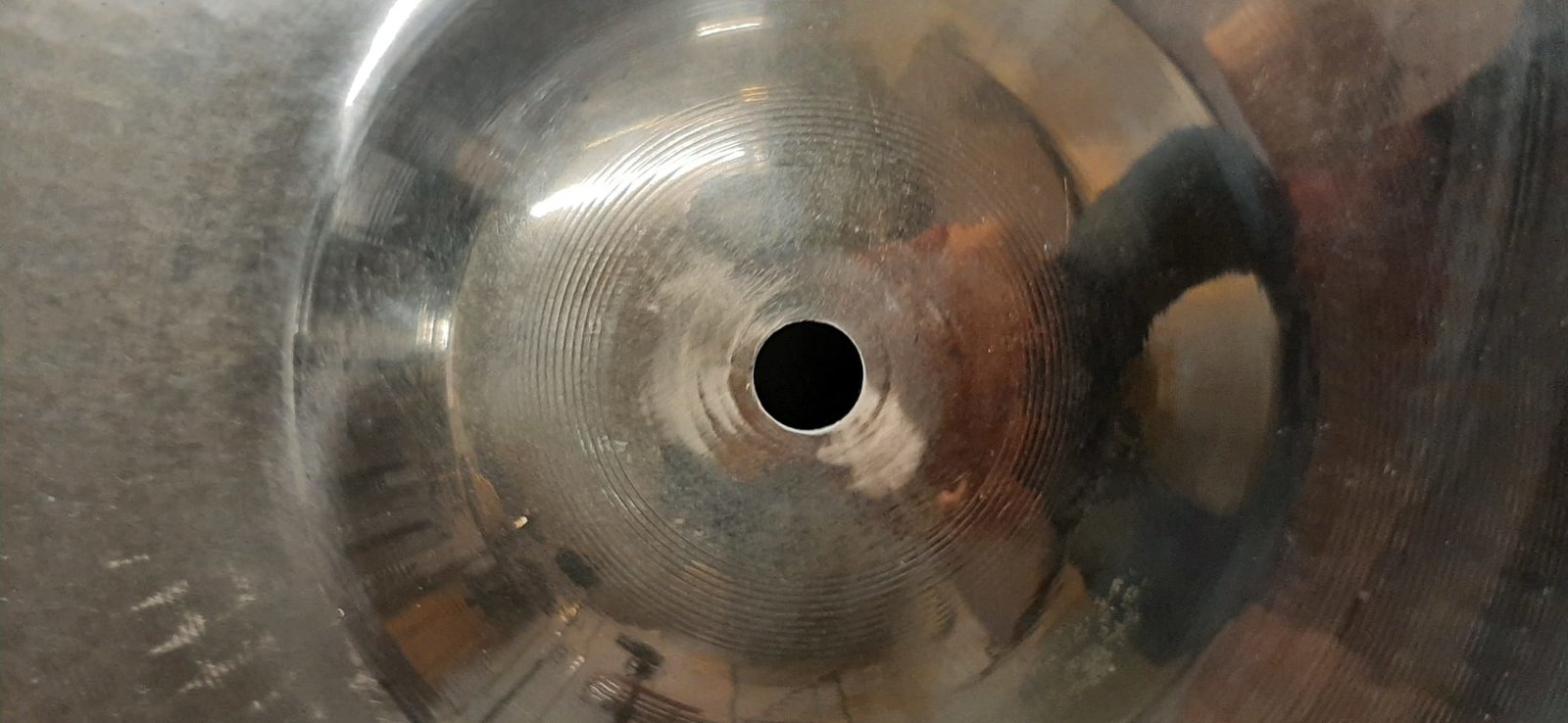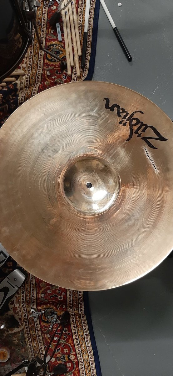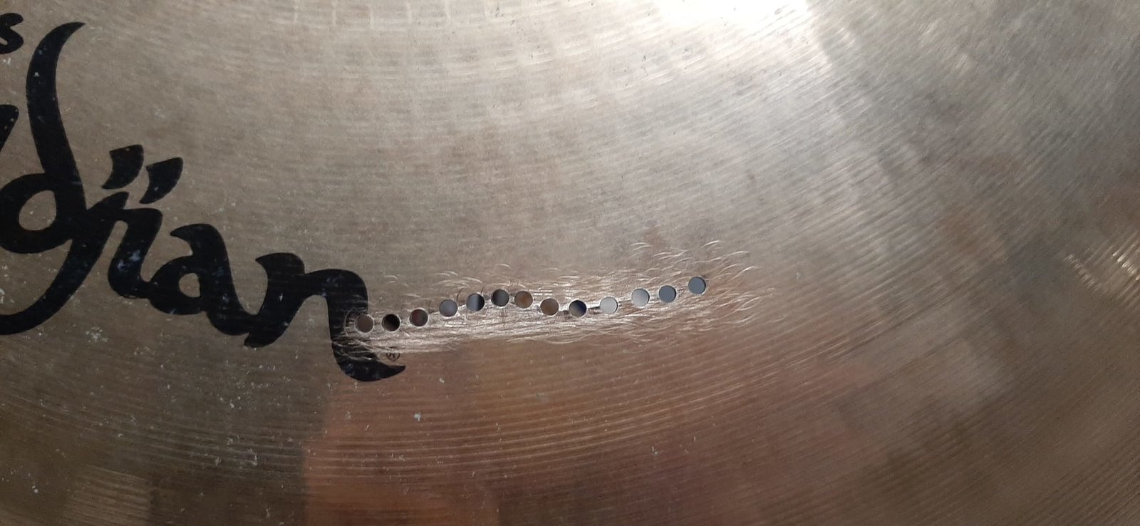 | Vajaavainen ilmoitus vielä... Luulin että pelkät poraamani-hiomani reiät estäisi lohkeaman särinän pellin soinnissa, mutta jäihän sitä yllätys, yllätys reikien väliinkin lohkeamat edelleen. Poraan peltiin vielä lisää, jotta saan yhtenäisen railon, jonka hion ja joka korjaa vielä soundin nykyiseen loppukuntoonsa. Mitä tuossa vaiheessa peltiä jo testailin, kuvailisin sitä edelleen projektiiviseksi, joka jo tehdyn fiksauksen myötä ominaisuutena nyt ehkä jopa vain korostuu (tipillä soitettaessa). Tietynlainen kuivuus/dryness kuuluu nyt myös pellin soundissa fiksauksen myötä. Tipin sijaan kapulan varrella eli crashatessä peltiä soittaessa, voluumiä ei tule ihan yhtä paljon kuin mitä ehjästä pellistä tulee, mutta luonnehdin silti kovaääniseksi rideksi tässäkin kohtaa. Keyhole, kupu ja muut osat pellistä alkuperäisessä kunnossa. Monipuolinen kovaäänisempi pelti kyseessä, jossa nyt ominaisuutena rajoitetusti volaa. Rockiin, metalliin, räpiin, popiin, souliin ja jazziin sopiva semi moderni komppipelti. Koitan tehdä Youtube-klipin viikonloppuna. Näytteitä saa pyytämällä. Tarjoa tässä kohtaa jotain, eiköhän tälle hinta keksitä. Hinta: 2112 € | |