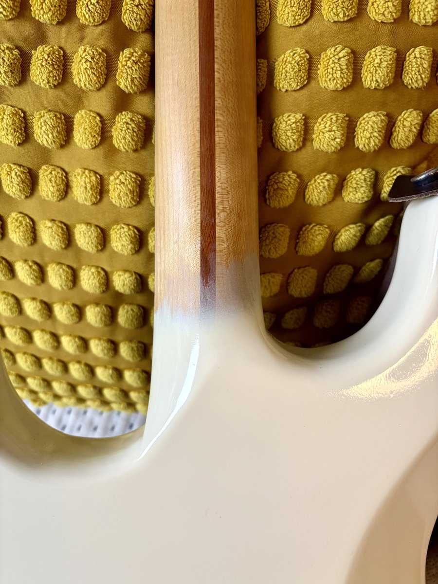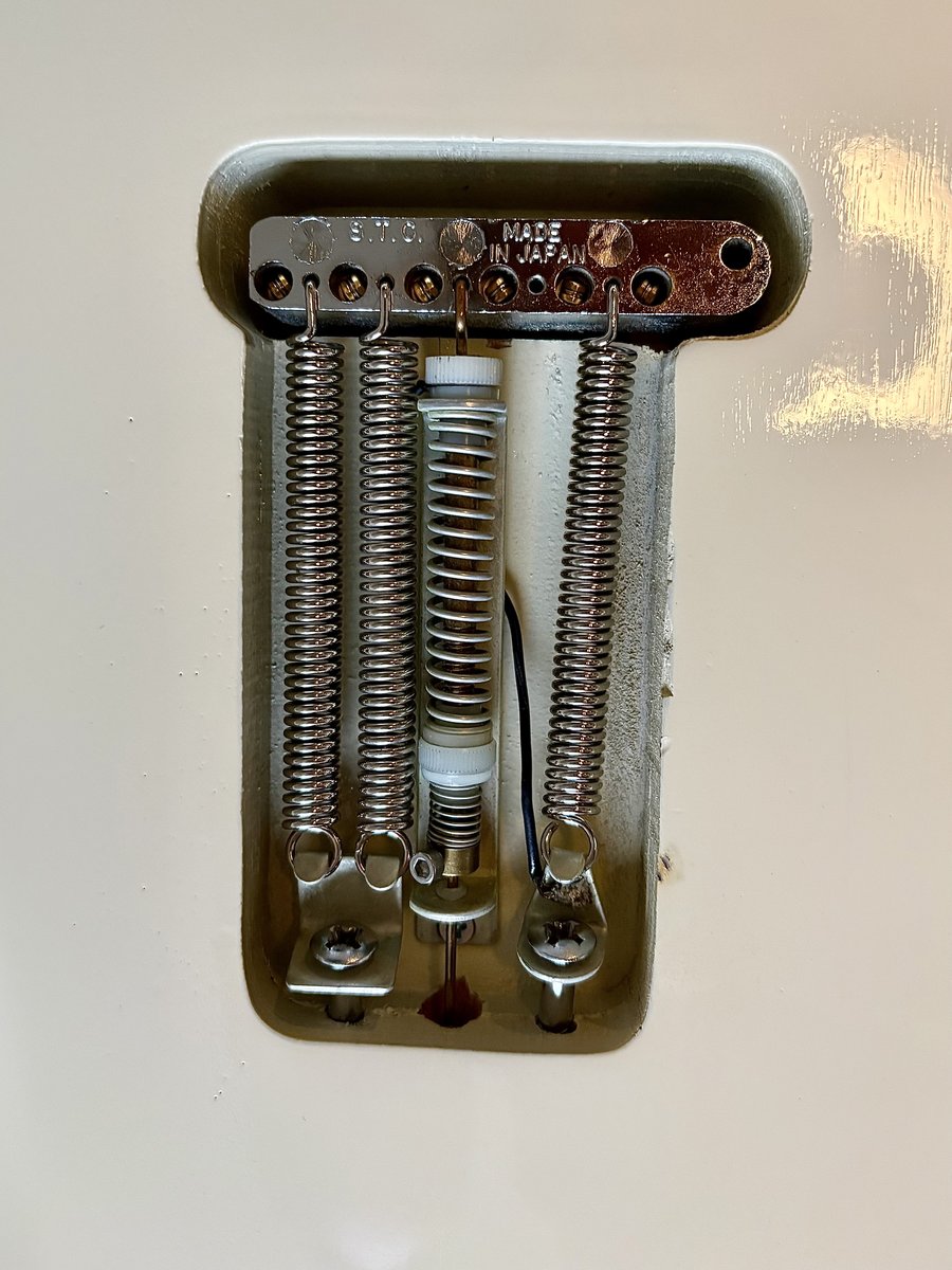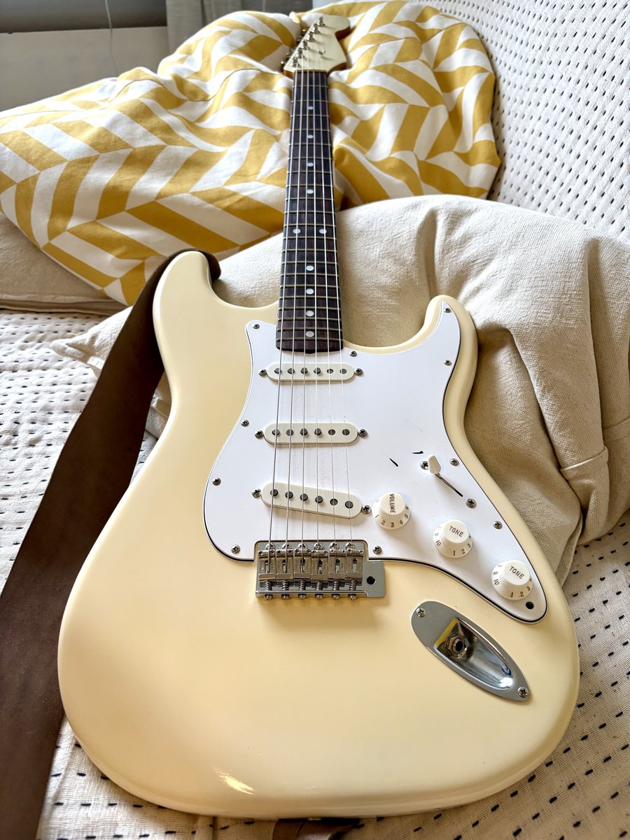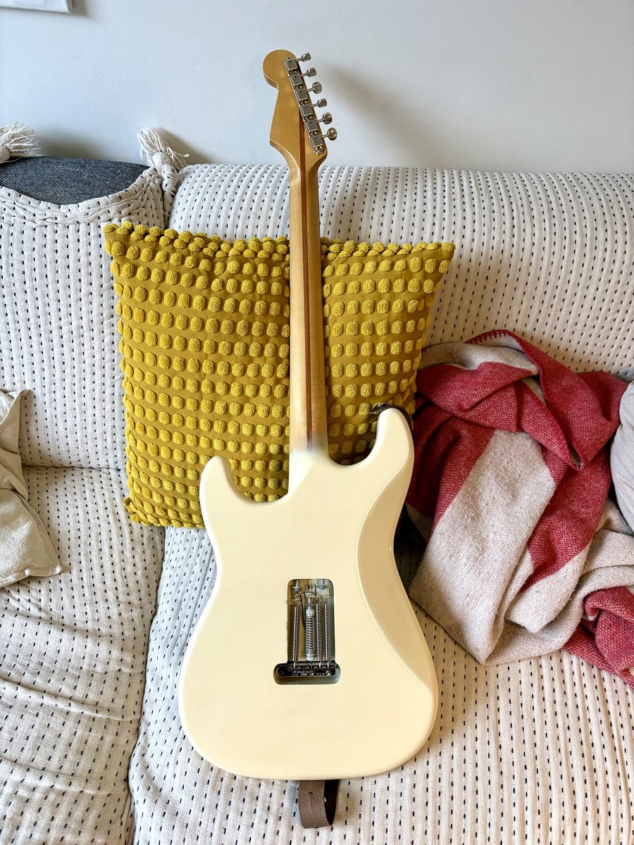 | Harvinainen japanilainen neck-thru Strat 70-luvun lopulta / 80-luvun alusta. Kitara on jälkikäteen maalattu ammattilaisen toimesta Olympic White värillä ja siihen on asennettu Tremsetter. Kaikin puolin erittäin hyvä kitara. Sustainia riittää, kuten neck-thru-kitaralta sopii odottaa! Mukaan pehmeä laukku. En mielelläni postita, mutta toimitus voi onnistua, jos matka on kohtuullinen. Vaihdot? Hyviä kitaroita ja pienehköjä putkivahvistimia voi toki ehdottaa. HP: 800 ¤ Hinta: 800 € | |