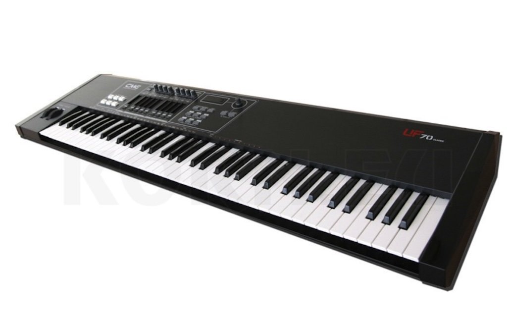 | Master keyboard from UF Classic series with very attractive design that features the end pieces finished in tough black shellac – just like a traditional piano. It features 76 semi-weighted velocity-sensitive keys with aftertouch and breath control interface, and UF DP-1 digital piano module with 80-voice sound and the Waldorf Nano Syn Card that contains over 1000 classic Waldorf Micro Q synth sounds – it can be turned into an audio sound card, a tone module, and a full-on synthesizer, complete with real-time control. Master keyboard provides over 20 ser template, non-volatile memories, pitch bend and modulation wheels, 8 assignable control knobs (preset functions including Cutoff/Resonance/Attack/Release/PAN/Reverb/Chorus/Variation), 9 assignable control faders (preset functions including volume for 1-16 channels and master volume, and drawbar for organ sounds), LED data display with control button (including program, transpose, octave, channel, keyboard split), 6 assignable shortcut knobs and 6 sequencer remote buttons (including REC, PLAY, STOP, FAST REWIND, REWIND AND RETURN TO START, etc). MIDI-out port, breath controller port, sustain pedal and volume pedal jacks are provided, as well as USB MIDI port that is class-compliant for Win XP and Mac OS X (power can be supplied via USB). Dimensions: 1232 x 348 x 113 mm. Weight: 11.8 kg. Black finish. Hinta: 100 € | |