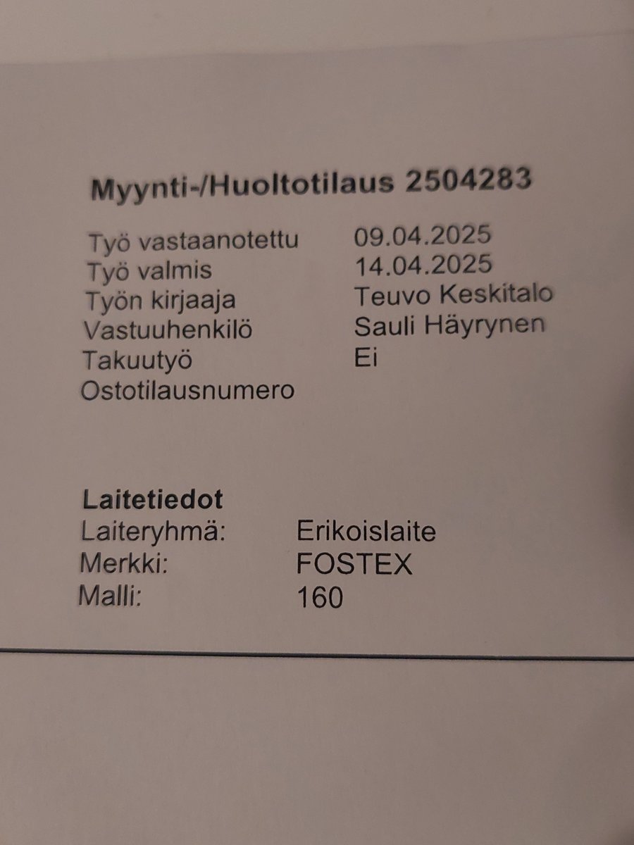 | Upea, toimiva Fostexin neliraituri, korjattu/huollettu huhtikuussa 2025 Oulun Huoltotalossa (huollon hinta 161,50¤ ja kuitti huollosta löytyy). Mukaan tuhti suomenkielinen ohje ja Fostexin oma virtalähde. Kaikki nupikat ja liu'ut on tallessa. Liitäntöjähän tässä on vaikka minkälaiseen settiin, Googlaamalla löytyy varmasti paremmat esittelyt, tässä ainakin yksi: https://www.muzines.co.uk/articles/black-to-the-future/12910 Nouto Oulusta onnistuu. Myös pakkausmateriaalia löytyy ja voin myös lähettää (Huom! Ostajan vastuulla). Paketin koko voidaan mittailla sitten jos siihen päädytään mutta asettunee Postin pakettikokojen L tai XL -paikkeille. Onnistuu myös Toridiilinä: https://www.tori.fi/32312162 Tarjoa hintaa! Vaihdossa en varsinaisesti mitään erityisesti tarvitse, mutta ei toki kiellettyä ole ehdottaakaan. Aina sitä saattaa jostain innostuakin, jos ei päittäin vaihtamiseen, mutta osana "rahoitusta". Hinta: 399 € | |