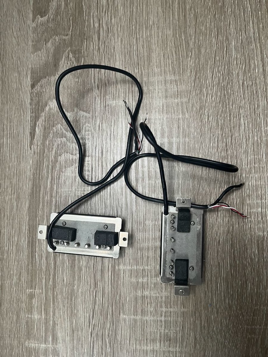 | Ostettu uutena ja ollut kitarassa alle pari vuotta. Mikkien jalkojen reikiä suurennettu, koska nämä olivat asennettuna ns. direct mount -tyylisesti, eli ilman reunuksia. Ei myöskään ruuveja mukana. Piuhat ovat aika pitkät, kuten kuvassa. Kysy, jos tarvitset tarkempia mittoja. Hinta: 250 € | |
