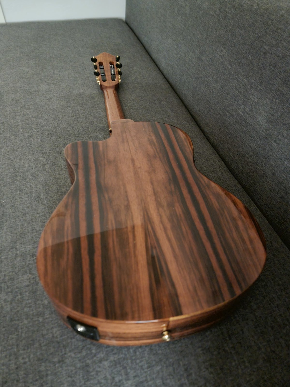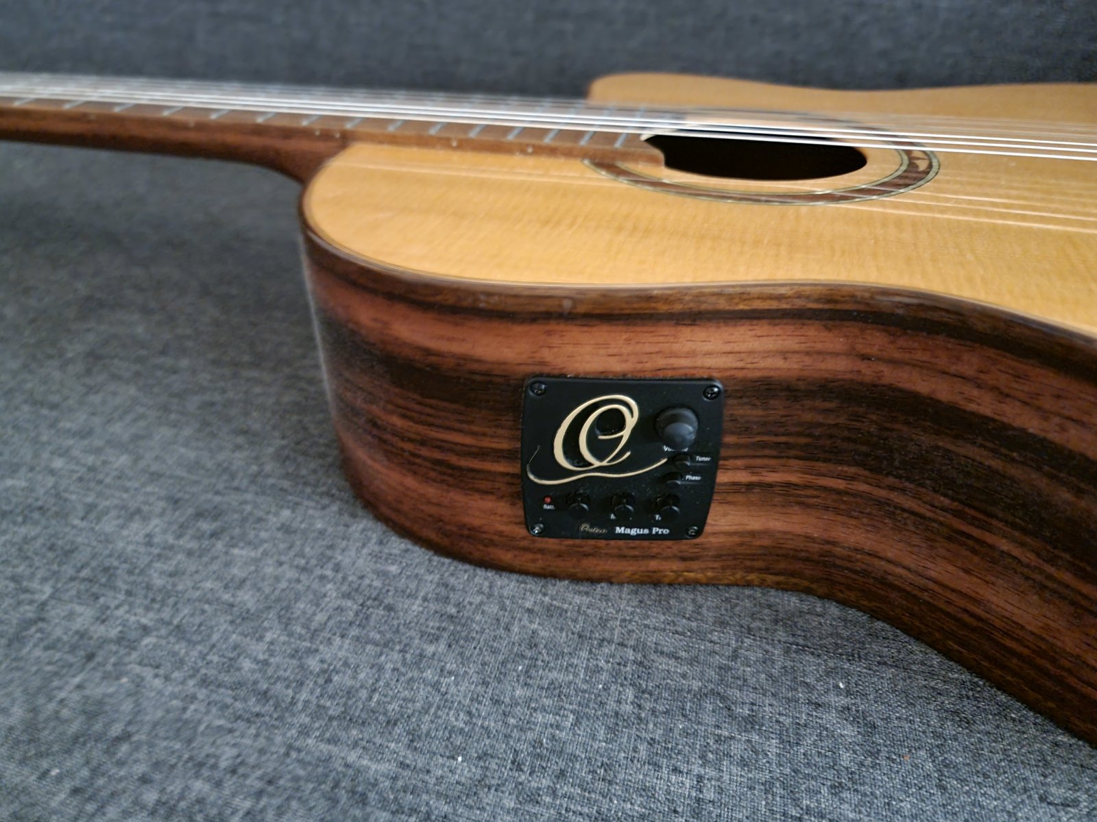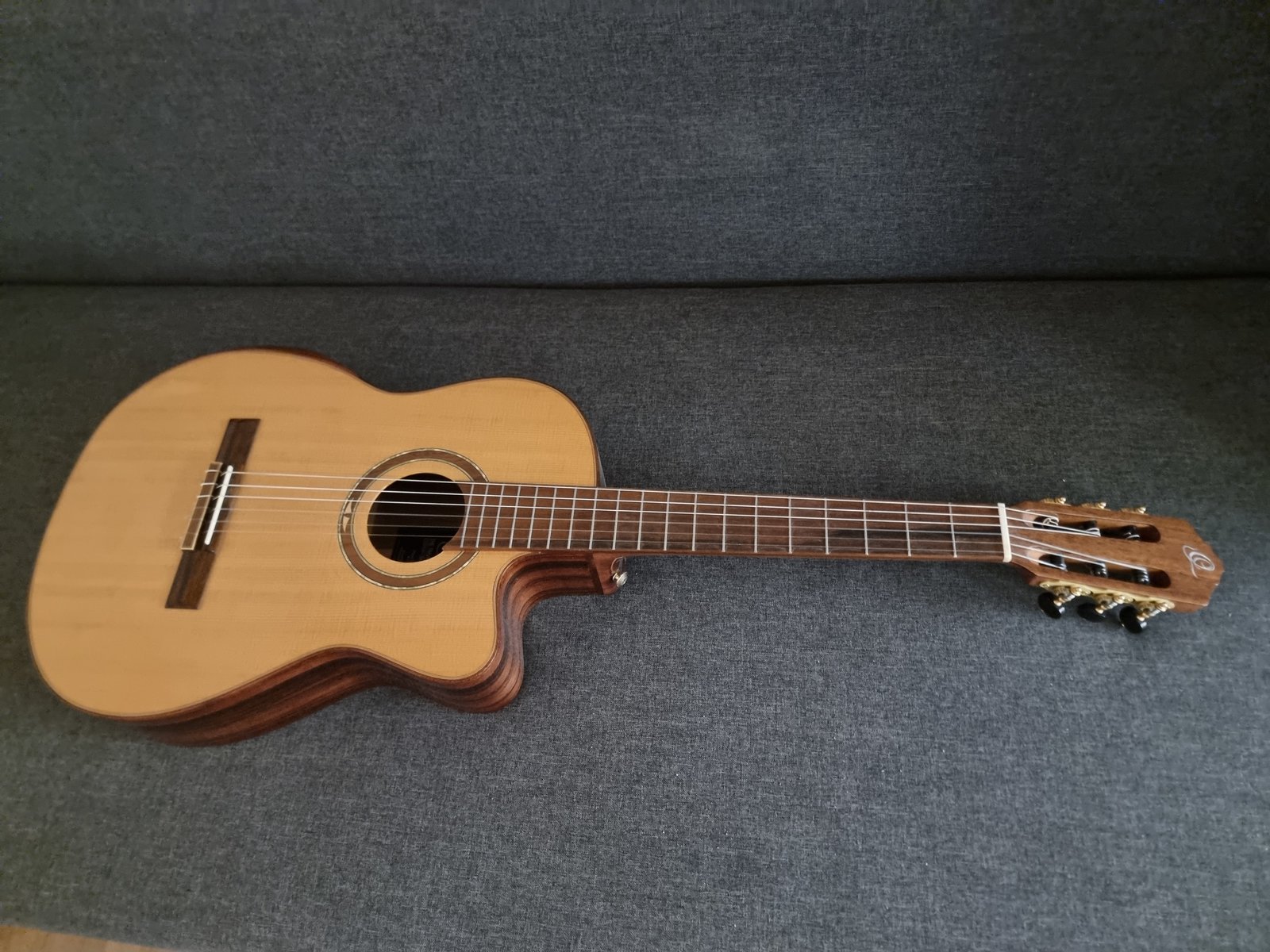 | Todella kaunis ja suoraan sanottuna virheettömässä kunnossa oleva nylonkielinen. Soi hintaisekseen erittäin hyvin ja muutenkin laadukkaan tuntuinen. Mukava soittotuntuma. Toisin kuin useimmissa nylonkielisissä, tässä on kaularauta jotta kaulan saa säädetyksi mieleisekseen, ja on ikään kuin "takuu" siitä, ettei kitaraa joudu viedä ammattilaisen suoristettavaksi 10-15 vuoden päästä mikäli ilmankosteus hyppii ym. Perus hyvä mikitys ja elektroniikka, en ole sitä juuri käyttänyt. Kitara on ollut kotikäytössä. OVH 750¤ huitteilla. Mukaan Ortegan oma kantopussi. Hinta: 430 € | |
