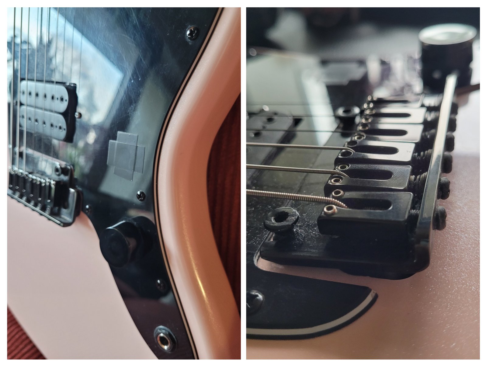 | Stratotallainen jazzmaster! Aktiivimikit on vaihdettu passiivisiin. Mikityksenä todella suuriulostuloinen Haven (nyk. Nova) Rotten Witness -setti. Tallamikin nimellisimpedanssi on 25kOhm ja muistaakseni mittasin itse sen olevan 23kOhm luokkaa. Kontrolleina 3-asentoinen mikkikytkin ja master vola, jossa nuppi ylös vedettynä mikkien puolitukset yksikelaisiksi. Tone on poistettu ja sen kohdalla on pragmaattisesti teippi paikkaamassa reikää. Tallapalojen korkeudensäätöruuvit on vaihdettu lyhyiksi siten ettei ne raavi plekukättä kuten alkuperäiset ruuvit. Tallan kampi tulee mukana vaikka se ei ole kuvissa. Tallaa ei ole blokattu. Nauhoissa ei kulumaa. Väri on pastellisävyinen "shell pink pearl", joka kimaltaa läheltä katsottuna. Hihnatappeina on Schaller-yhteensopivat tapit. Voin jättää nuo tai vaihtaa tavalliset tilalle riippuen et mikä sopii ostajalle paremmin. Säädetty Drop B -vireeseen. Nouto ja koesoittelut onnistuu Kannelmäessä. Hinta: 350 € | |