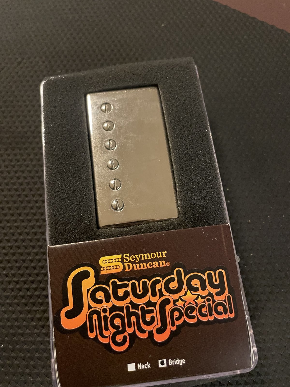 | Nikkeli kuorinen Saturday Night Special tallamikki, ”Laadukas humbucker alnico 4 -magneeteilla, Autenttiset 1970-luvun rock-soundit, Laadukas suojattu johdotus” Ei sopinut omaan hommaan, johtoa ei lyhennetty ja puolituspiuhat nätisti kutistesukan sisällä. Mukaan ruuvit ja jouset. Nouto helsinki, kalasatama Hinta: 110 € | |