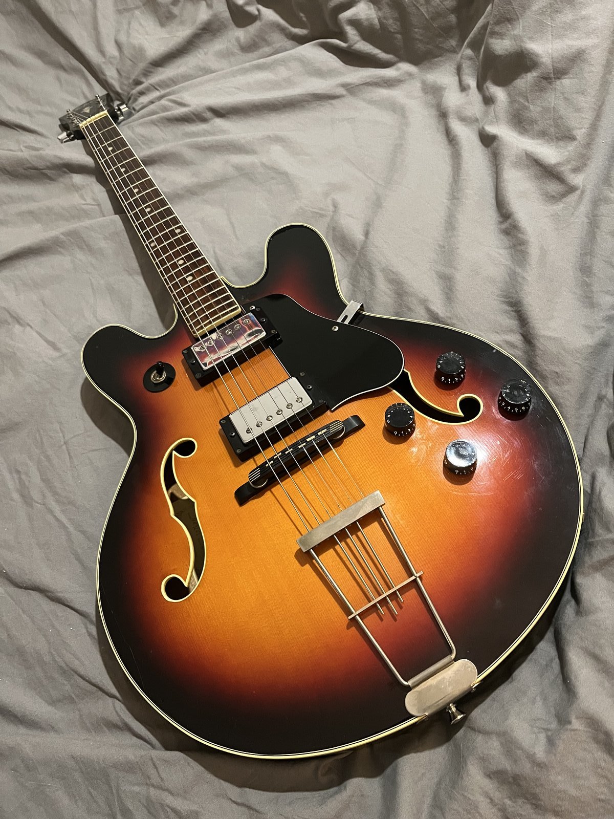 | Tästä mainio puoliakustinen kasarilta, silloisesta Länsi-Saksasta. Mainio peli, juuri säädettynä huollettuna, otelauta öljyttynä. Kauheesti ei kuukkeli tästä kerro, mutta peli kertoo itse itsestään, olevansa vallan hyvä, Schallerin mikit, nyyberit Elixirin 10-46 kielet. Matalalla actionilla helpposoittoinen kaveri. Jokainen osa ja yksityiskohta kertoo laadusta, yksistään jo rautapuoli, kieltenpidin, virikoneet(Gotoh), elektroniikka kunnollisilla potikoilla, switchillä ja noilla todella hyvillä Schallerin mikeillä ja kun katsoo tuota puista tallaa, siinä on taidonnäytettä kerrakseen, intonaatiot säädetään noilla mitä ilmeisimmin mandoliinin nauhoista tehdyillä paloilla. Vähän ajan hammasta, jotain crackia lakassa, vaan ei mitään rakenteellista, plekusuoja vaihtunut matkan varrella, muuten ilmeisimmin alkuperäisissä asetuksissaan. Tässä on centerblock, joka ei kuitenkaan ole kanteen asti, joten akustinen soundi on sinne Gibsonin es330 suuntaan. Soi todella herkästi ja noi mikit poimii kyllä hyvin soundit. Hankala tälle mitään hintaa sinänsä sanella, kun ei ole mitään verrokkia, mutta 750¤ lienee ihan ok, oman näkemyksensä hinnasta saa toki kertoa? Kitaraa tässä on varmasti sen edestä, kuitenkin sangen hieno soitin, onhan tämä jo ”vintage-ikäinenkin”, sekä varsin oman persoonallisuutensa omaava, ei voi sanoa että näitä ihan joka oksalla roikkuis. Noutohommaa ja käteismaksu, laukkua ei ole, mutta kotiinkuljetukseen soveltuvan pussukan saa mukaan. Sähköisiin soundeihin voidaan tutustua treeniksellä Pohjois-Helsingissä, Fenderin combon läpi. Nuo pakolliset vaihtoehdotukset kyllä kuunnellaan, oikein mitään ei tarvii, mut eihän sitä koskaan tiedä, jos tulee jotain oikein jännää vastaan, etupäässä kuitenkin ihan myynti. Hinta: 750 € | |