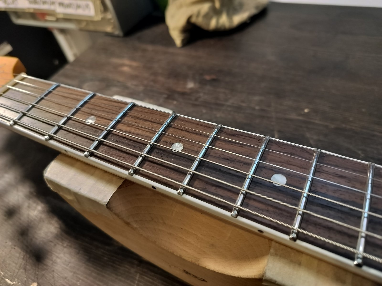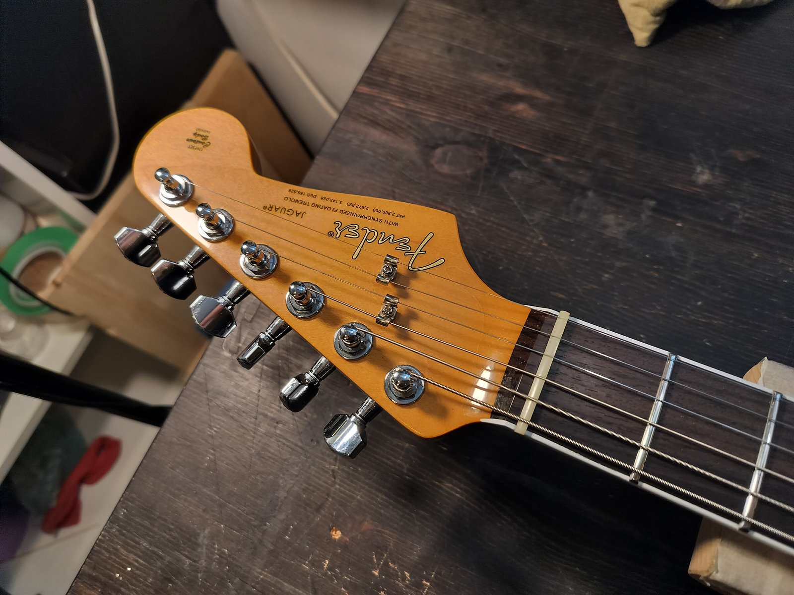| Myydään huippuunsa trimmattu Fender Kurt Cobain Jaguar (MIM). Kitara on siistissä kunnossa. Alkuperäinen laukku, kampi, kirjanen ja paperit ovat tallessa. Koulutettu ammattilainen on vaihtanut kitaraan Hoscon jumbo-kokoiset (2,9x1,4mm) teräsnauhat ja luisen yläsatulan. Mikeiksi on vaihdettu Lace Sensorin Bill Kelliher Aggressors -setti. Huoltoja on tehty n. 400¤:n edestä ja kitara on saatettu optimaaliseen soittokuntoon. Tehtaalta tullessa alkuperäiset nauhat eivät olleet tasassa, yläsatulaurat olivat viilattu miten sattuu, tallaa ei saanut tarpeeksi alas, jne. Eli tavanomainen Fenderin/Gibsonin tehtaalta tullut kitara. Ja koska tällä palstalla uudet Nokian renkaat Ladassa laskevat myytävän auton arvoa, on nämä soittimen soitettavuutta parantavat toimenpiteet huomioitu hintapyynnössä. Hinnassa huomioitu toimituskulut. Kitaran/laukun suojaksi löytyy kyllä pahvilaatikko. Yhteyden saa parhaiten viestitse. Hinta: 880 € | |