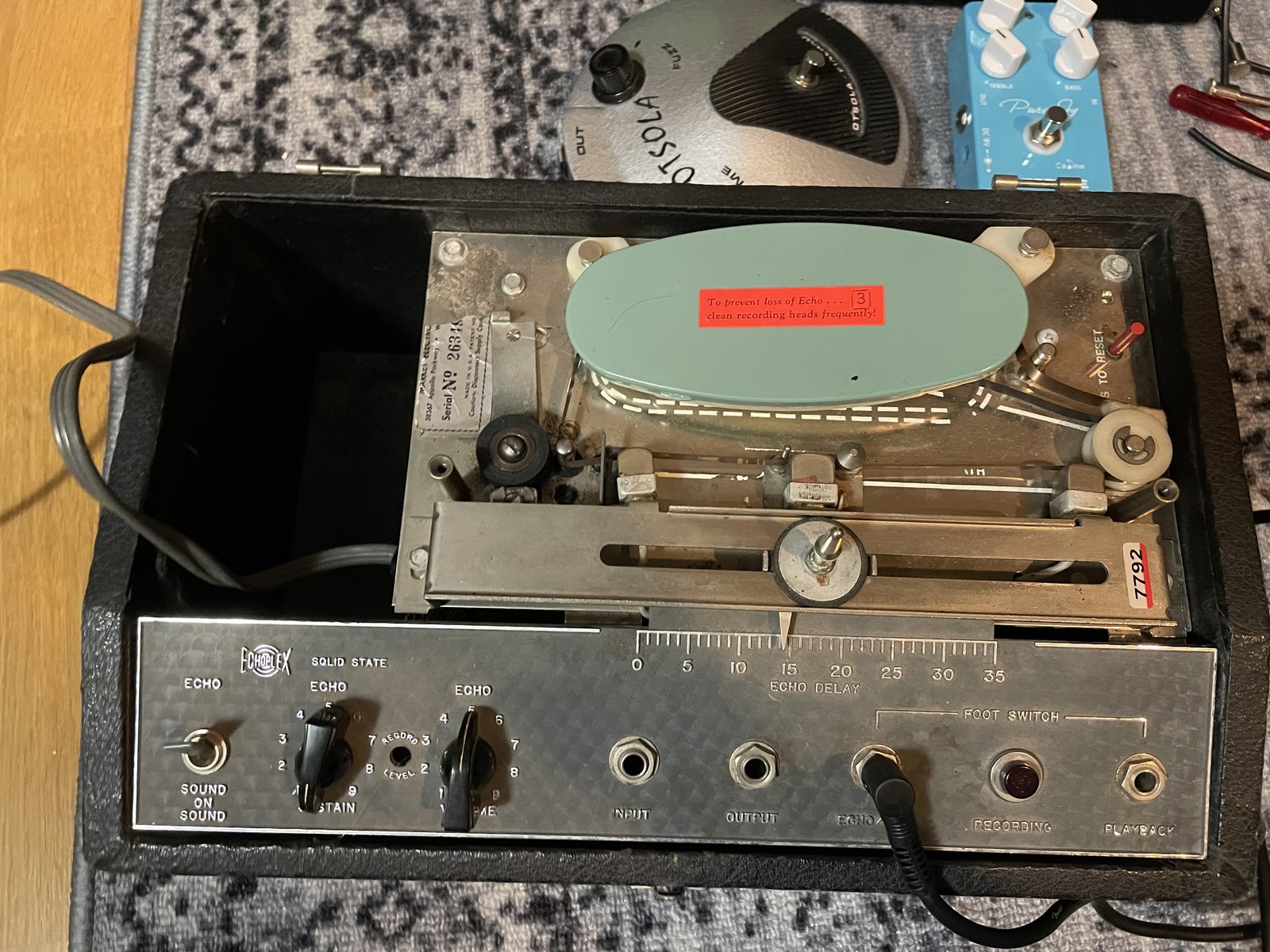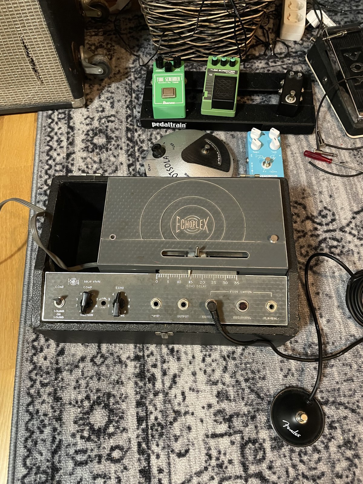 | Juuri huollettu 70-luvun nauhakaiku myyntiin. Huollossa vaihdettiin muutama vastus ja konkka, pinch roller uusittiin myös. Ainoana miinuksena kotelon puuttuva kansi, mistä johtuen ei ole kauhean roudausystävällinen…tosin eivätpä nämä muutenkaan ole. Mukaan tulee Fenderin jalkakytkin sekä toinen nauhakasetti. Vain nouto, tätä en uskalla ruveta lähettelemään. Hinta: 800 € | |
