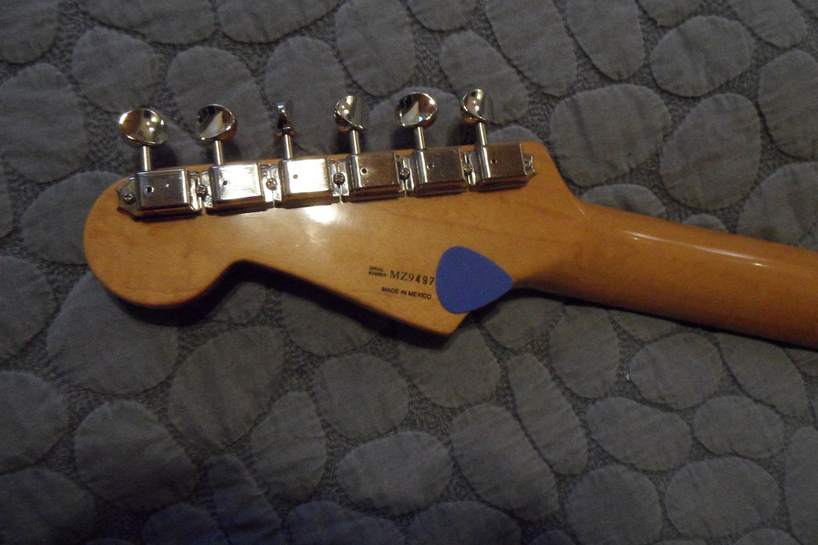 | Tässäpä tarjolla keräilijälle tai suoraan soittoon tosi siisti ja hyväkuntoinen kitara, voidaan melkein puhua Closet Classic -kunnosta - on sentään soitettu, nauhoissa aivan pieniä kulumia. Kohtuullinen paino, kokonaismassa 3 kg tai inasen päälle. Classic Series oli Meksikon parasta laatua koskaan, ja arvostus on vain noussut vuosien mittaan. Hinnat maailmalla pyörivät tonnin molemmin puolin. Alkuperäinen kokoonpano, kampikin mukana. Lähetys onnistuu 40 ¤ lisämaksulla. Uuden veroinen Warwick Rockcase kova tweed-laukku mukaan +70 ¤. Product Specs Body Alder Body Finish Polyester Body Shape Stratocaster® Bridge 6-Saddle Vintage-Style Synchronized Tremolo Bridge Pickup Vintage-Style Single-Coil Strat® Color Black Configuration SSS Control Knobs Aged White Plastic Controls Master Volume, Tone 1. (Neck Pickup), Tone 2. (Middle Pickup) Country Of Origin MX Fingerboard Rosewood Fingerboard Radius 7.25" (184.1 mm) Fret Size Vintage-Style Hardware Finish Chrome Middle Pickup Vintage-Style Single-Coil Strat® Model Name Classic Series '60s Stratocaster®, Rosewood Fingerboard, Black Neck Finish Gloss Urethane Neck Material Maple Neck Pickup Vintage-Style Single-Coil Strat® Neck Shape "C" Shape Number of Frets 21 Nut Material Synthetic Bone Nut Width 1.650" (42 mm) Orientation Right-Hand Pickguard 3-Ply Mint Green Pickup Configuration SSS Pickup Switching 5-Position Blade: Position 1. Bridge Pickup, Position 2. Bridge and Middle Pickup, Position 3. Middle Pickup, Position 4. Middle and Neck Pickup, Position 5. Neck Pickup Position Inlays Ivory Dot Refinement Neck Material Maple Refinement Neck Shape C Shape Refinement Pickups Vintage-Style Scale Length 25.5" (64.77 cm) Series Classic Series String Nut Synthetic Bone Truss Rods Vintage-Style Butt Adjust Tuning Machines Vintage-Style Hinta: 600 € | |