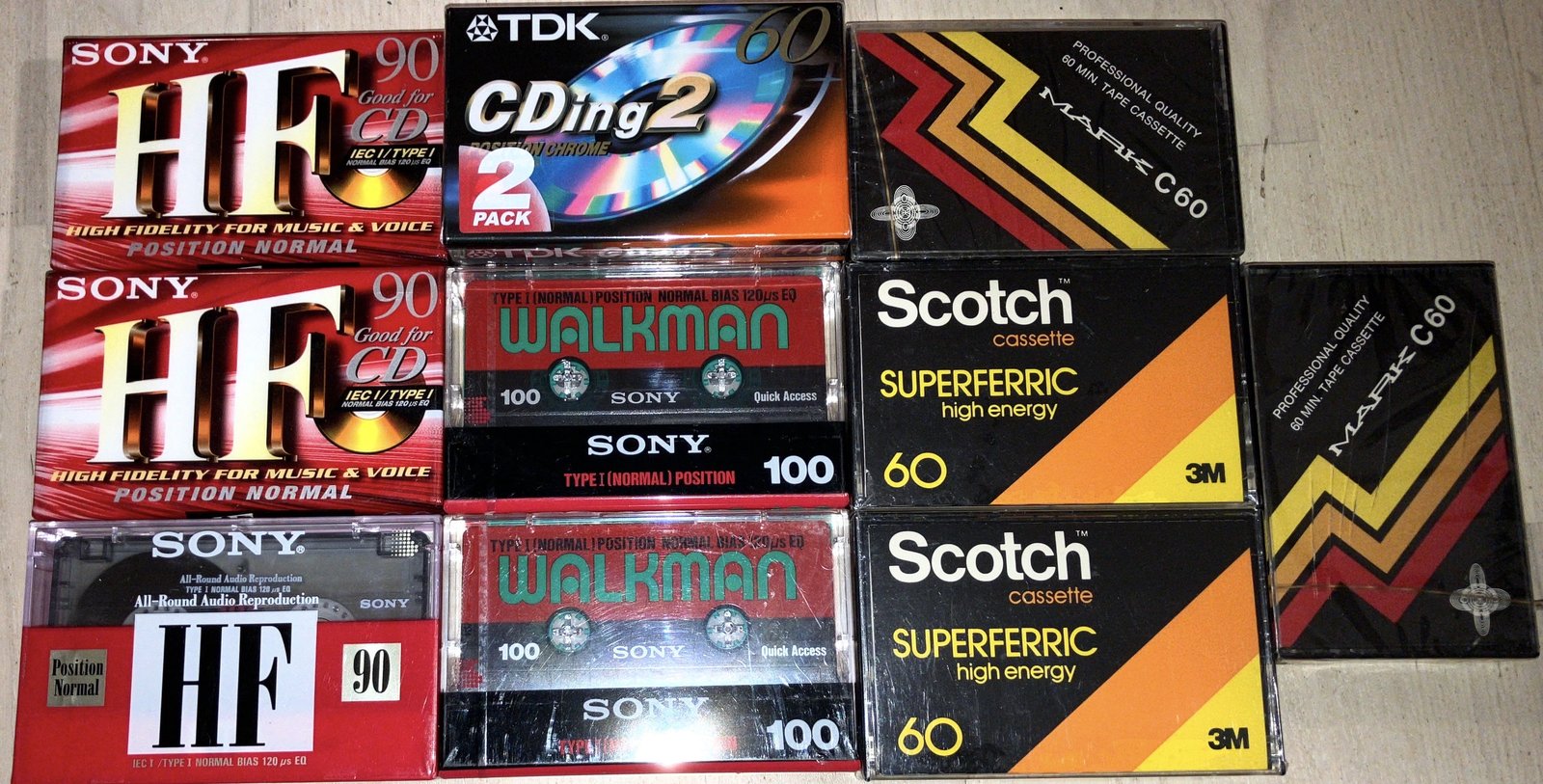 | Myynnissä kuvassa näkyvät avaamattomat kasetit (11 kpl) yhtenä nippuna. Parissa "Mark C 60" -kasetissa kotelot näyttäisivät ottaneen iskua. Vaikka kasetit ovat avaamattomia, niin kasetin/nauhan luonteesta johtuen ne myydään siinä kunnossa kuin ovat, sellaisenaan ilman takuuta mistään. Kaupat vain kädestä käteen HKI:ssa. Hinta: 30 € | |