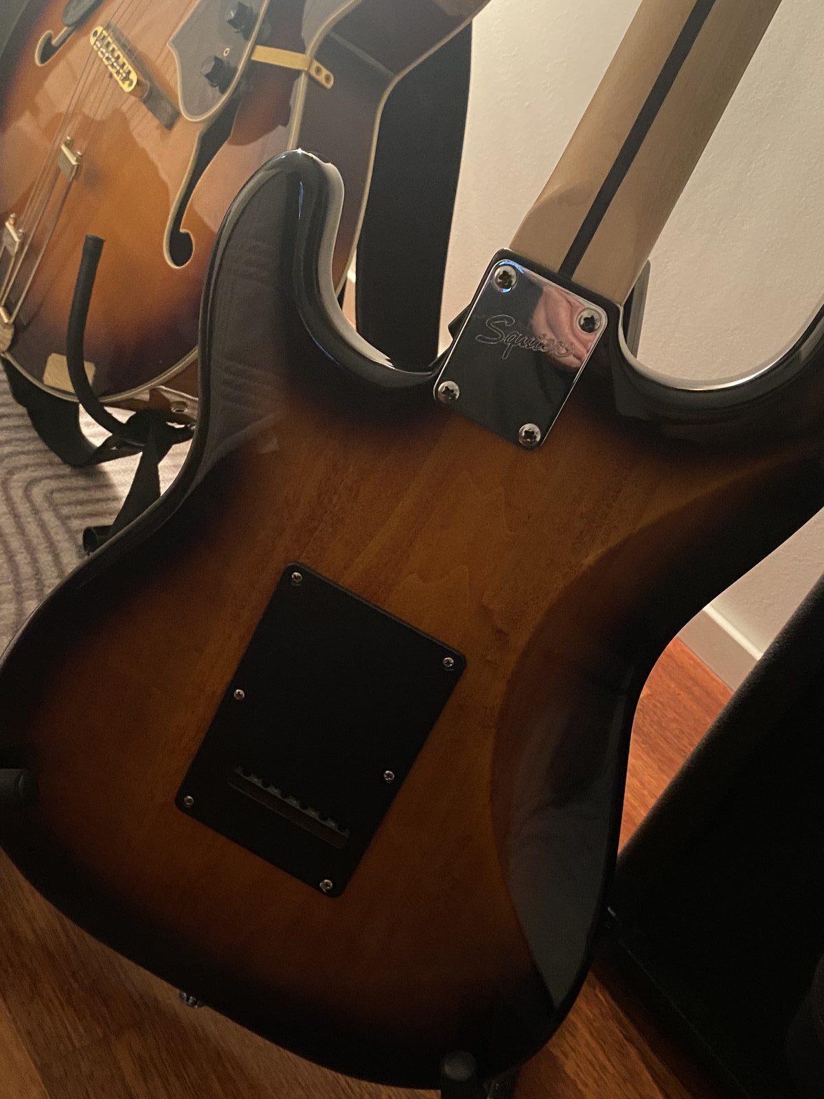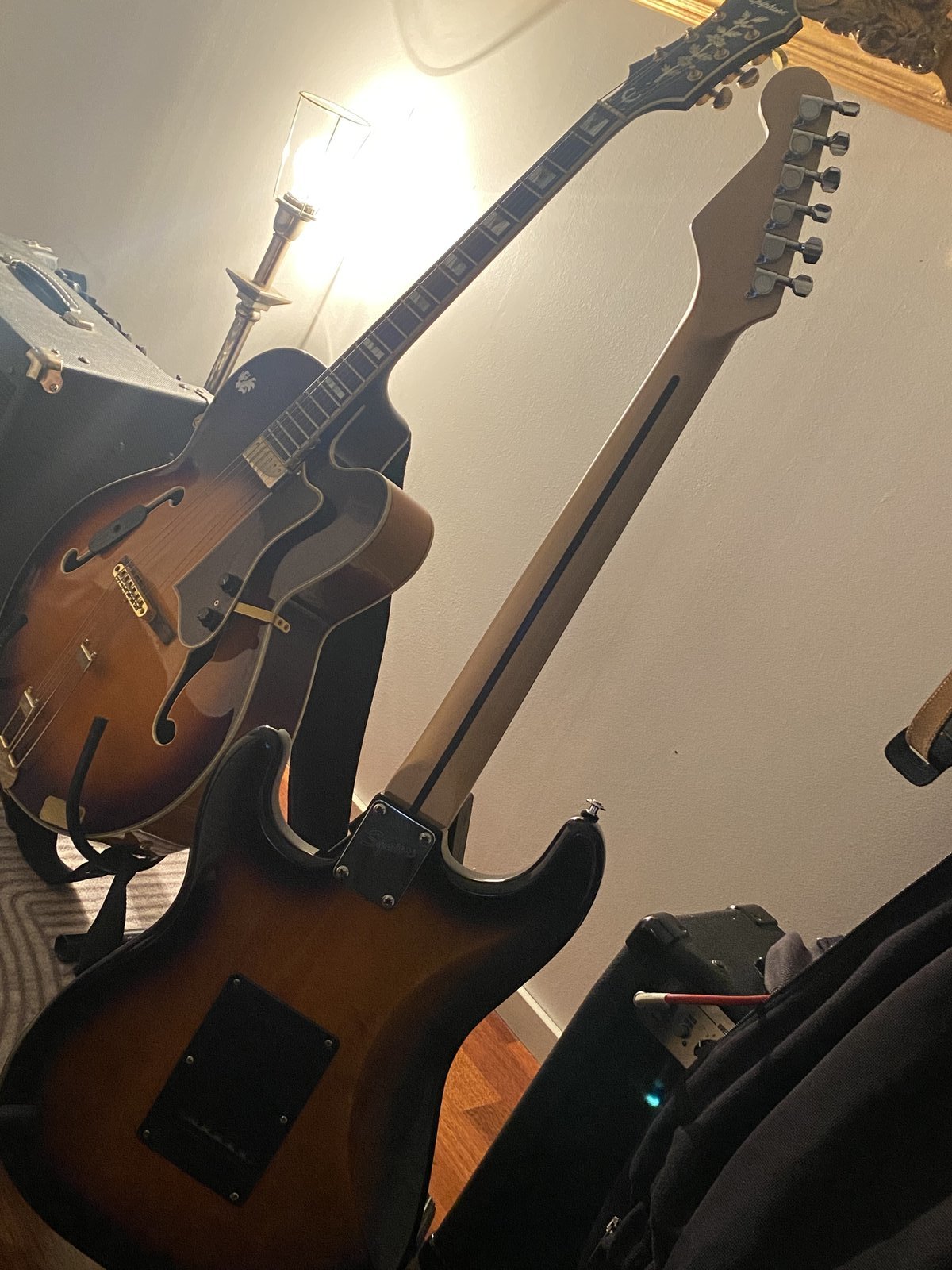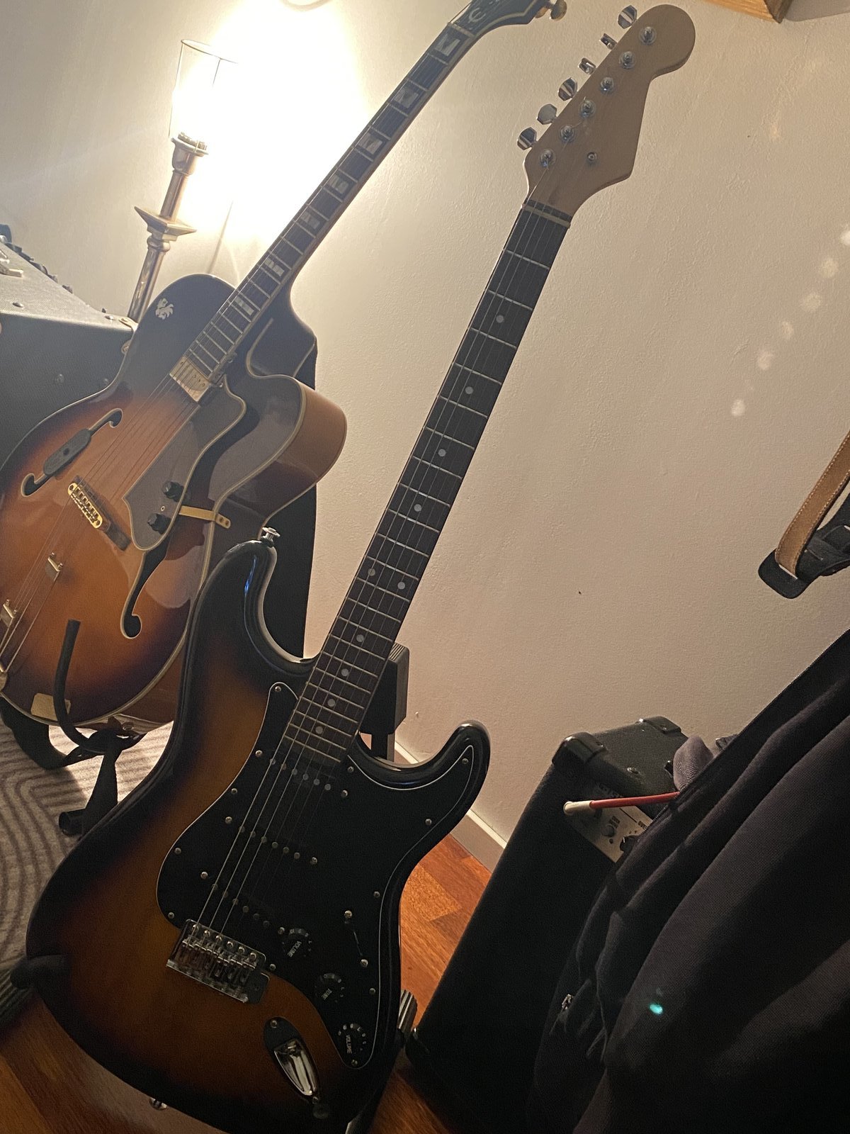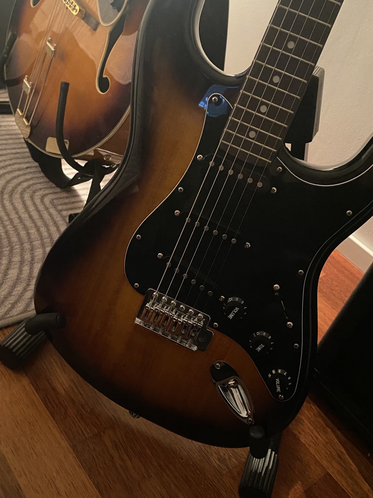 | Itse maestro joppejoon kyhäämä Strato Hyvä kuntoinen soi kuin unelma. Nauhat hyvät ei hierveästi jälkiä kaula siisti body siisti kaikki toimii niinkuin pitääkin. Huollan ennen myyntiä Runko poppeli Väri:2T SB Kaula Vaahtera Väri Natural Satin Kaula profiili C Skaala 25,5 Satulan leveys:41,5 Kaulan paksuus 1 st 21,5 mm - 12 23,0 mm Otelauta Ruusupuu Otelaudan radius 9,5`` Nauhat 22 Medium jumbot Talla mikki Ut Alnico 5 - 6,5 kOhm Keskimikki ut Alnico 5 - 6,1 kOhm Kaulamikki ut Alnico 5 - 6,1 kOhm Säätimet -Tone -Volume-Blender (talla-ja kaula) Plexsi 3ply Black Mikkiswitch 5 asentoinen Virittimet Jinho Talla 52.5 mm tremolo Hardware color kromi /nikkeli Paino 3.2 kg Hinta: 199 € | |