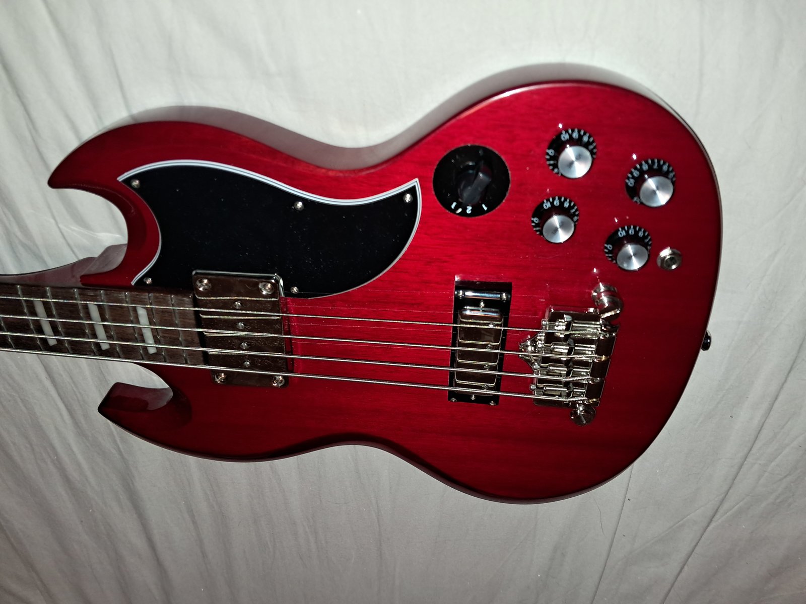 | Käytännössä uusi ja soittamaton tänä vuonna ostettu basso uuteen kotiin. Ollut kotisoitossa kakkosbassona, soiteltu muutama kerta. Alla basson "tekniset" tiedot. Virheetön, ei naarmuja/kolhuja, kaikki lippulappuset  mukana. Mieluiten nouto tai voin toimittaa Lahti-Kvl suuntiin, lähetys omassa alkuperäisessä pahvilaatikossa onnistuu ostajan riskillä! Uusi Thomanilla 409eur! SG Style Mahogany body Set-in mahogany neck Rosewood fretboard (Dalbergia Latifolia) Slim taper "D" neck profile Scale: 34" Trapezoid inlays Pickups: 1 Sidewinder humbucker and 1 mini humbucker Chrome hardware Colour: Cherry Red Hinta: 250 €  | |