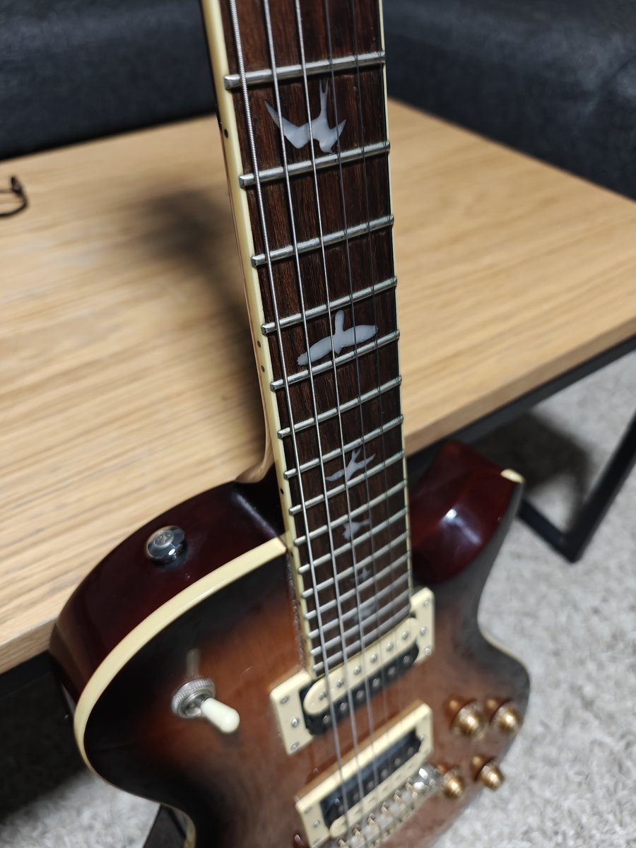 | Otsikon hyvä soittoinen, kuuloinen ja nätti Prs tyrkylle. Onhan nämä hintaluokassaan aivan lyömättömiä pelejä. Resonoi, pitää vireen ja on oikeasti keikkavalmis kitara ilman turhuuksia.  Ainut syy vaihtohalukkuuteen on mieltymys hieman raskaampaan musiikkiin, joten kokeillaan jos joku haluais vaihtaa hevikeppinsä hieman perinteisempään. Jos ei mene, ei harmita. Tämä saa soittoaikaa kuitenkin. Nauhat hyvät, ei mainittavia kolhuja, hiusnaarmuja takana muutama. Vaihdossa esp ltd Viper/EC/MH, superstrato tai h/h Tele, 6-kielinen baritoni, PRS se Ce/custom.  | |