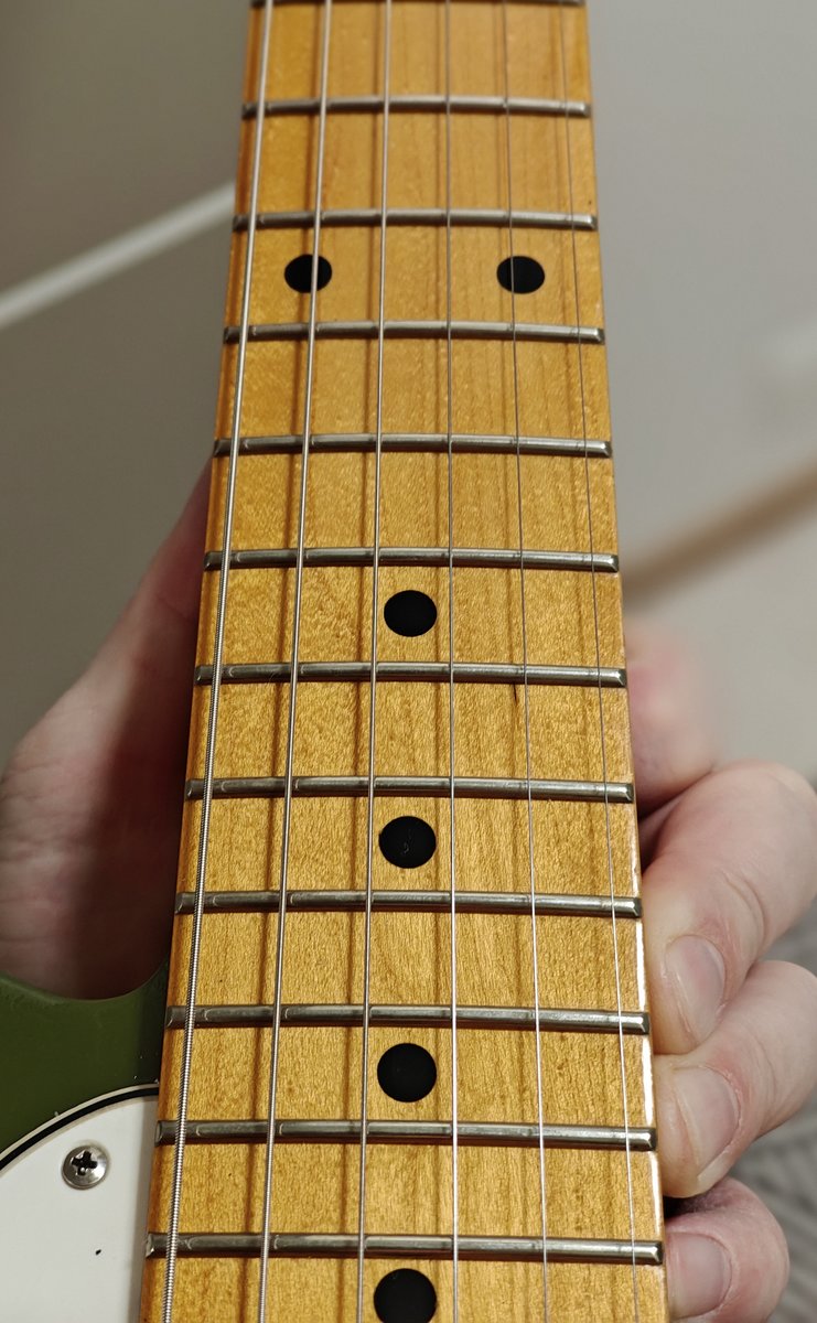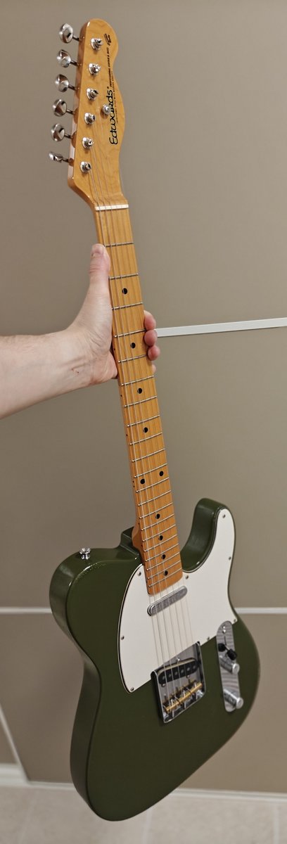 | Pari vuotta sitten ostettu Helsingin musamaailmasta, nyt tätä mallia siellä ei enää ole. ~ Tonnin kepukka ollut uutena, Japanissa tehty. Olen toinen omistaja, ensimmäinen omistaja meinasi kaivertaa kannen, mutta into lopahti. Ostin tämän että oli kannesta maalit jo poistettu. Poistin itse loput maalit kesällä ja vedin army/ Olive nitromaalilla ja relic nitrolakalla päälle. Muutamassa kohdassa epäpuhtautta reunoilla mihin maali/ lakka ei ole tarttunut, lisäksi pinta ei ole tasainen koska hain relic lookkia muutenkin. Alkuperäinen musta pleksi mukaan, nyt Saksasta crazy guitarpartsilta ostettu relic 3ply pleksi kiinni. Mikit perus hyvät alnico telemikit, voin katsoa mittarilla outputin jos ostajaa kiinnostaa. Body on kevyt 2- palan suosaarni, löytänen kuvan siitä. Kaulalla soitettu alle 10h, nauhat priimaa. Kaula on hiukan fenderin modern- c lihaisampi, enempi noita vintera 60- c mallia, mutta ei todellakaan 50- nocaster tasoa. 9,5" radius, medium jumbo nauhat. Infoa: https://www.sonovente.com/en-gb/esp-edwards-ete98asm-blond-p99648.html Kova laukku mukaan, onnistuu myös lähetys laukun kanssa tai ilman kaula irroitettuna jos laululle ei tarvetta/ Matkahuollon hinnat hirvittää. Noutajalle, on myös antaa mukaan loput lakat jos haluaa. Lisäksi melkein täysi butterscoth nitrolakka antaa mukaan. Ei tarvetta vaihdoilla, kitaroita toistaiseksi liikaa, tietänette. Hinta: 500 € | |