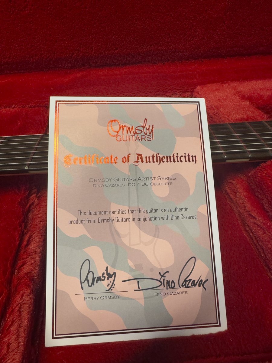 | Selling a MINT condition Dino Cazares Red Camo due to no use. Excellent guitar. BODY: Swamp Ash, 38mm thick. NECK: Laminated Rock Maple, with Bubinga centre. Carbon fibre neck reinforcing rods. Bolt-on. NECK SHAPE: Consistent 18mm flat D shape (exactly the same as Dino's CustomShop guitars). FRETBOARD: Ebony. 16" (406mm) radius. NUT: Graphite. SCALE LENGTH: Your choice: either 26.5-27.5" Multiscale, or 26.5" Baritone. Read about Multiscales,. TRUSS ROD: Dual action style, adjustment at end of fretboard. FRETWIRE: Jumbo Stainless Steel. INLAY: N/A. SIDE DOTS: Block inlays. HARDWARE COLOUR: Black. BRIDGE + MACHINEHEADS: Ormsby Custom bridge, and locking machineheads. ELECTRONICS: 1x Volume, 9v, with reverse mount side jack. O-ring style knob. PICKUPS: Seymour Duncan Dino Cazares 'Machete' model. FINISH BODY: Red Camouflage (Blood Camo), Transparent Purple (Violaceous), Transparent Black (Max Blak). All finishes are satin. FINISH NECK: Oiled. OTHER: Forward strap pin located on flush mount dowel. Hardcase included. Certificate of Authenticity, signed by Dino Cazares and Perry Ormsby. Hinta: 1800 € | |
